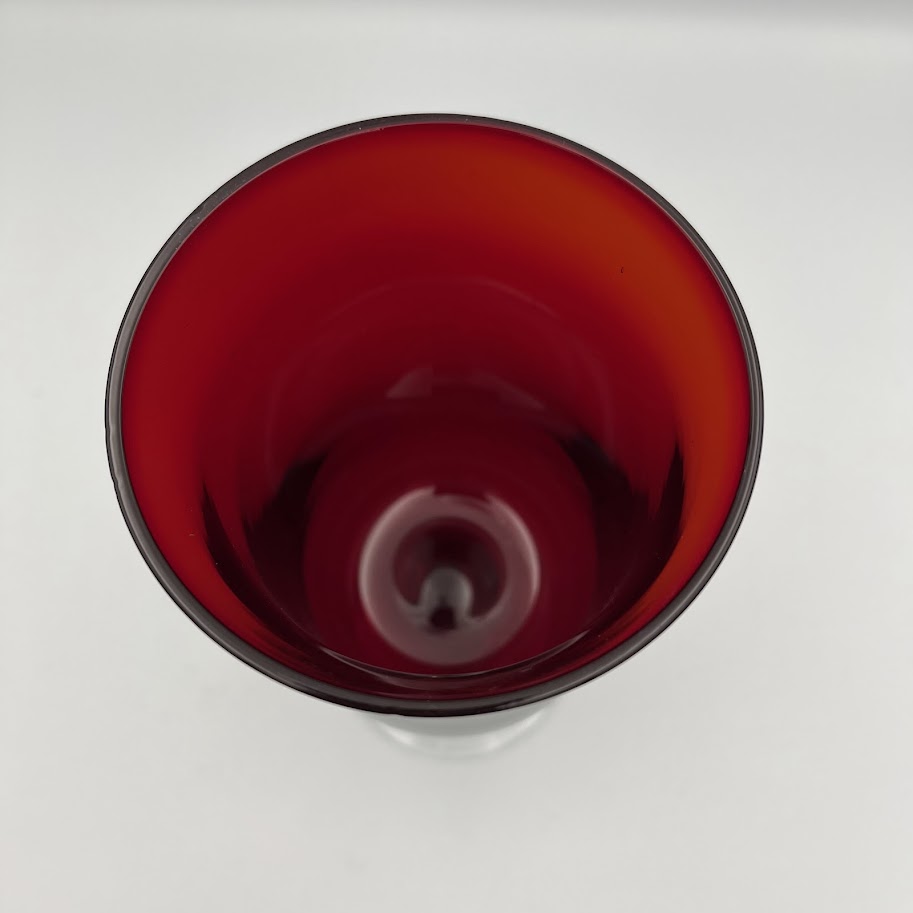 Smukt vintage glas i dyb rød farve med elegant, klar stilk og fod.