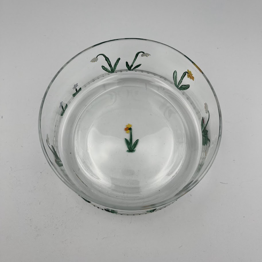 Sød og dekorativ glasskål med håndmalede blomsterdetaljer.