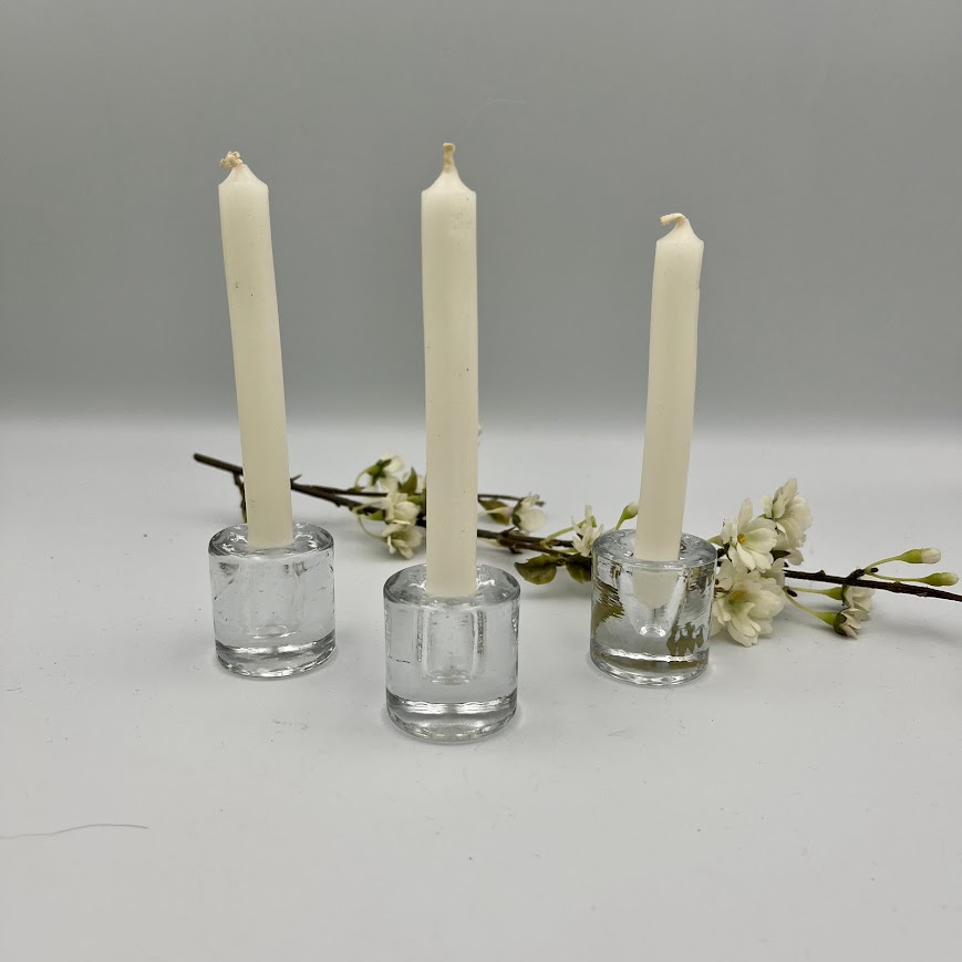 Sæt med 3 små fyrfadsstager/lysestager i klart glas med et enkelt og tidløst design.