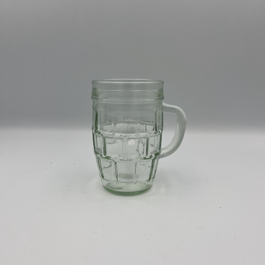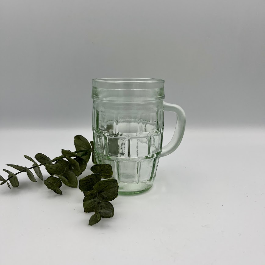 Ølkrus i glas med hank og relief – klassisk og rustikt.
