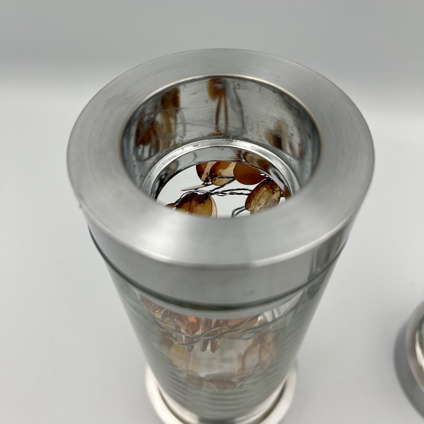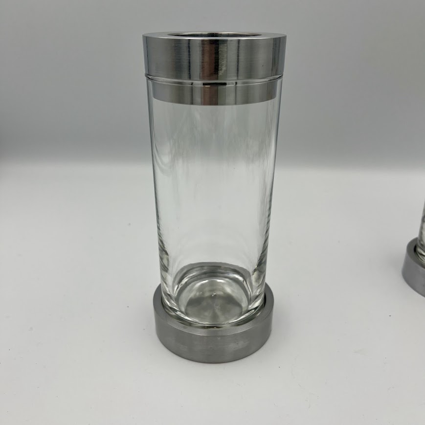 Stilren lysestage fra Menu i moderne design med kombination af klart glas og børstet metal.
