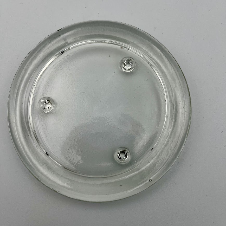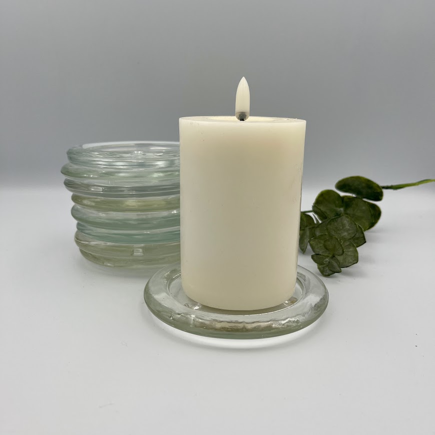 Enkel og funktionel glasbakke til bloklys i klart glas med tre små fødder.