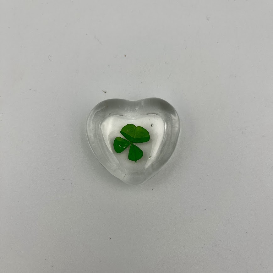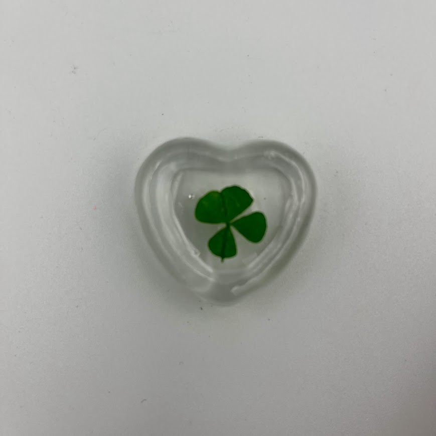 Sødt og dekorativt lille hjerte i klart glas med indstøbt firkløver.