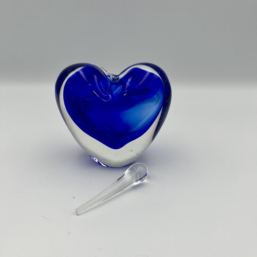 Smukt dekorativt hjerte i glas med en flot blå kerne indkapslet i klart glas.