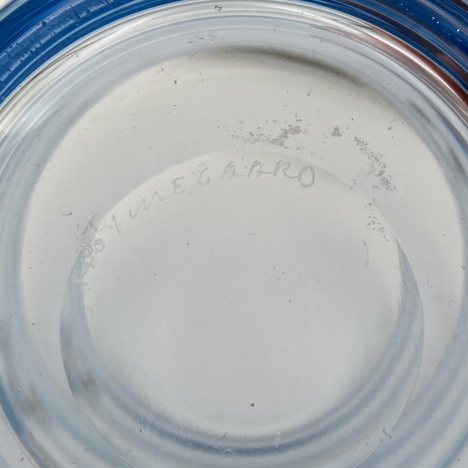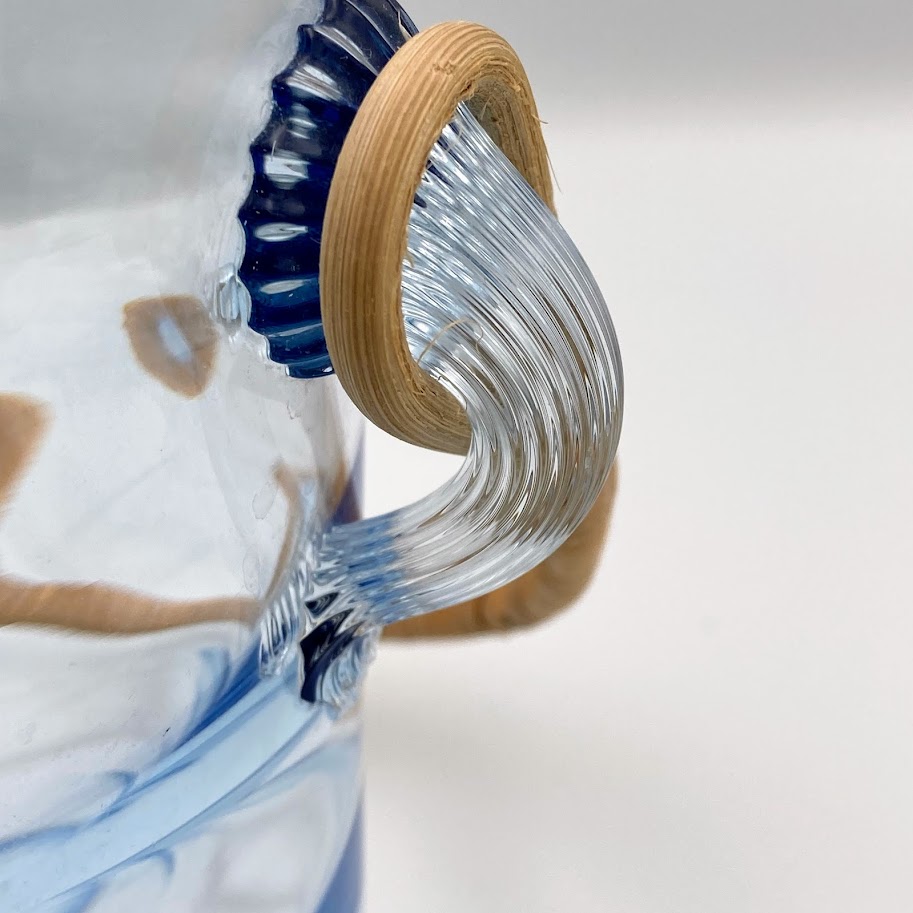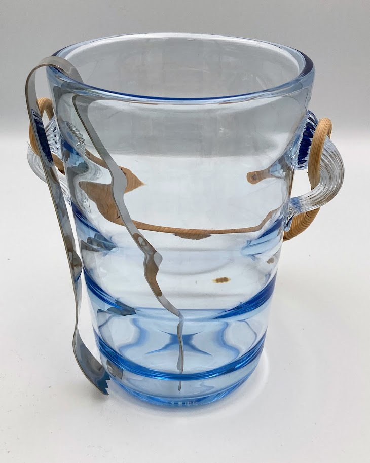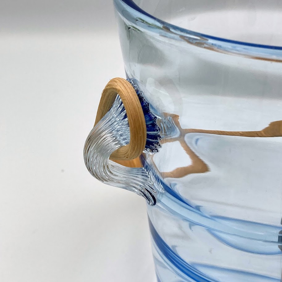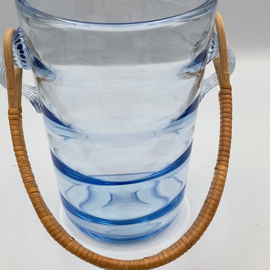 Elegant isspand i kraftigt, i blåligt glas. Spanden har to håndtag med flettet rattan/bambus og medfølgende istang i metal.