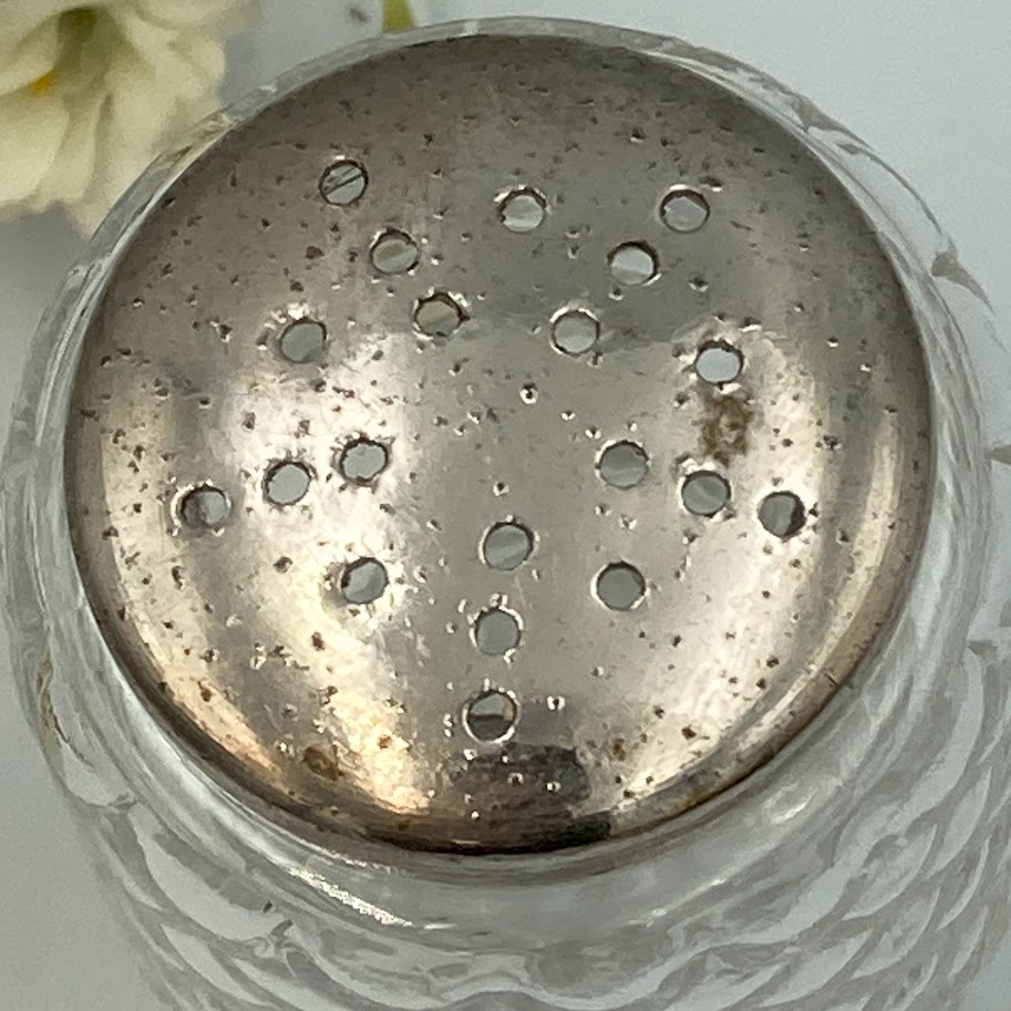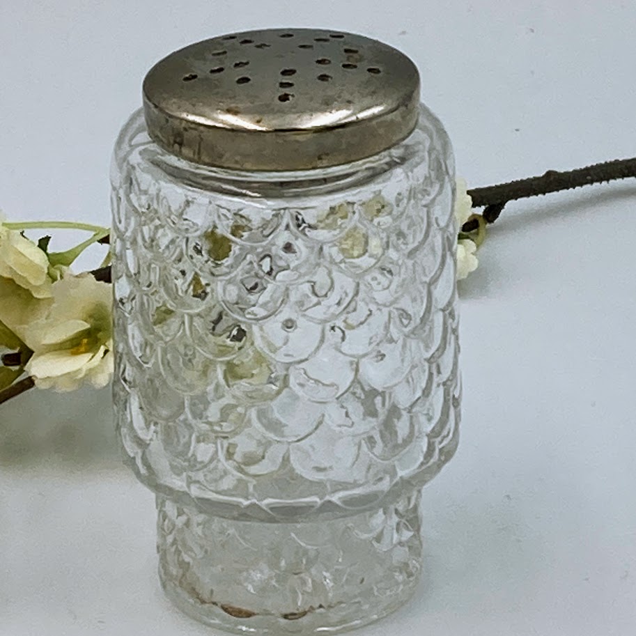 Ældre sukkerdåse i presset glas med mønster og metallåg til drys.