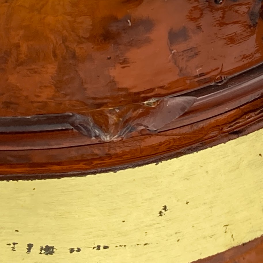 Kruset har guldfarvede bånd og kraftig hank i trælook, som giver et klassisk værtshus- og tivoliudtryk.