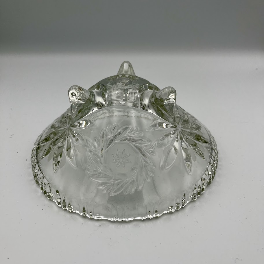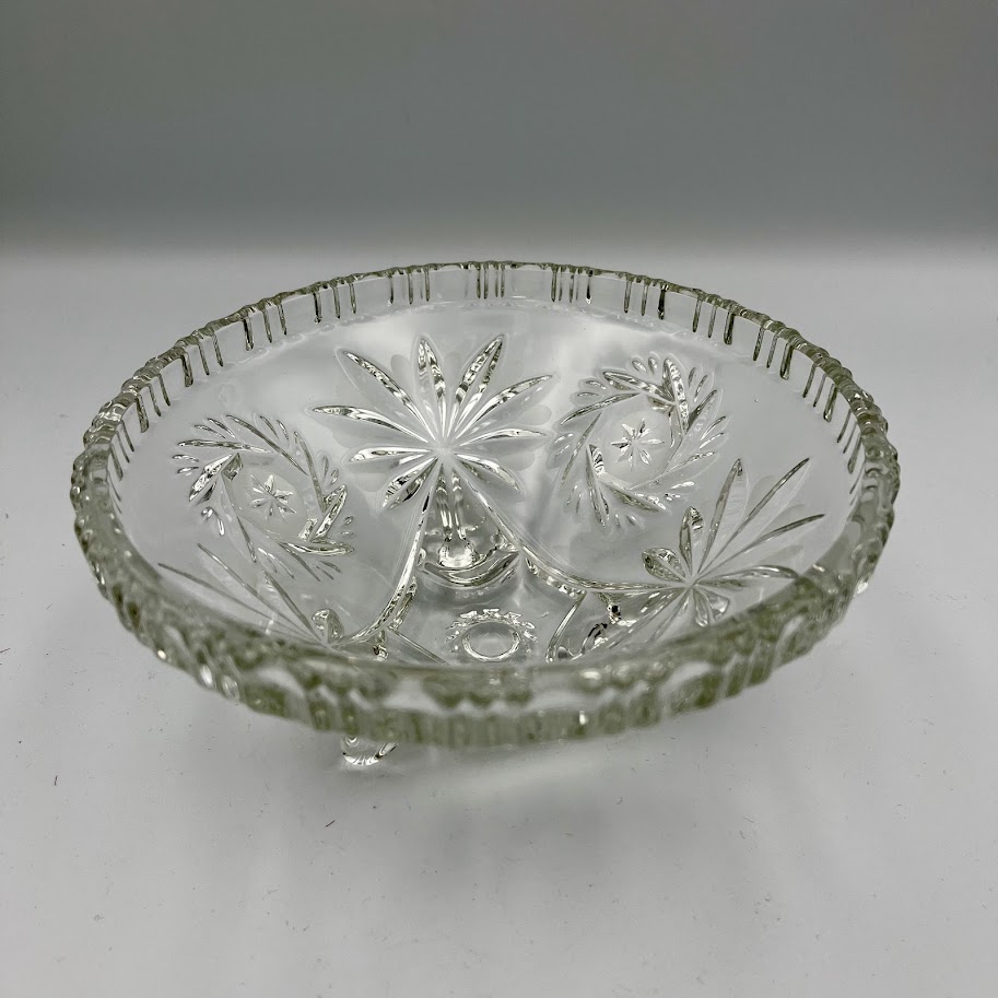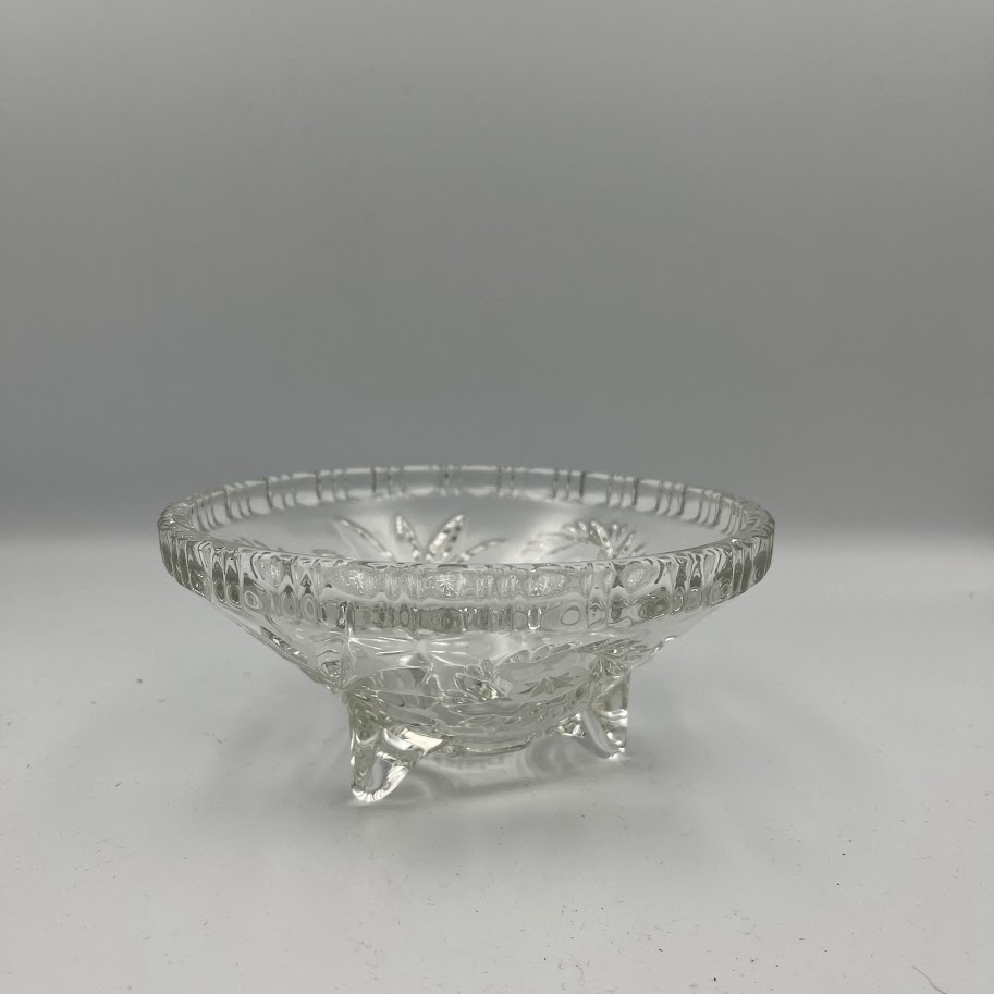 Lille dekorativ glasskål i klart presset glas med smukt mønster og tre små fødder.