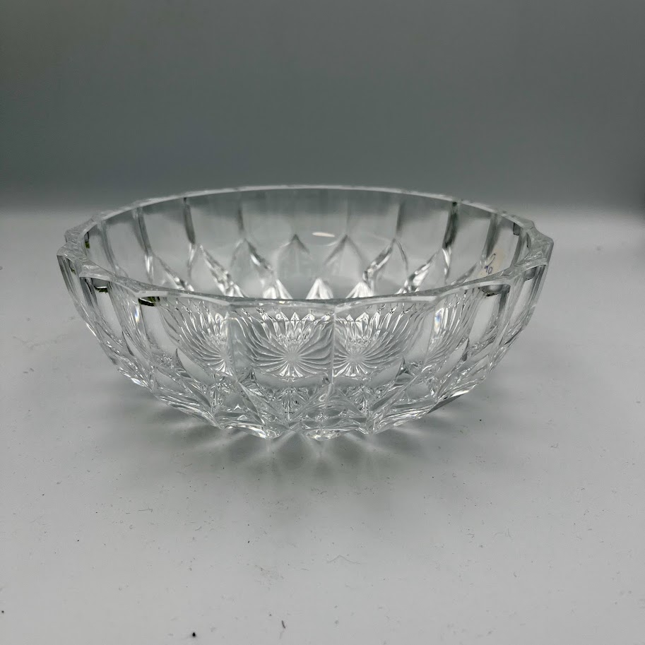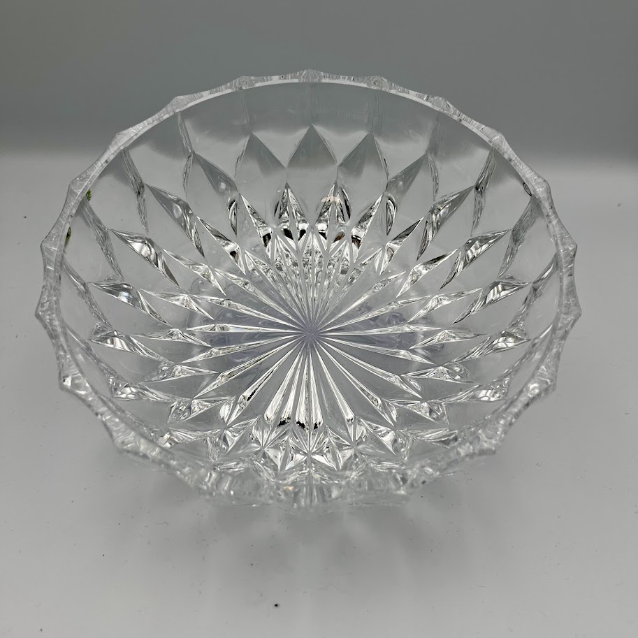 Klassisk facetslebet glasskål i klart glas med stjernemønster og dekorativ kant. Elegant og velegnet til både servering og pynt.