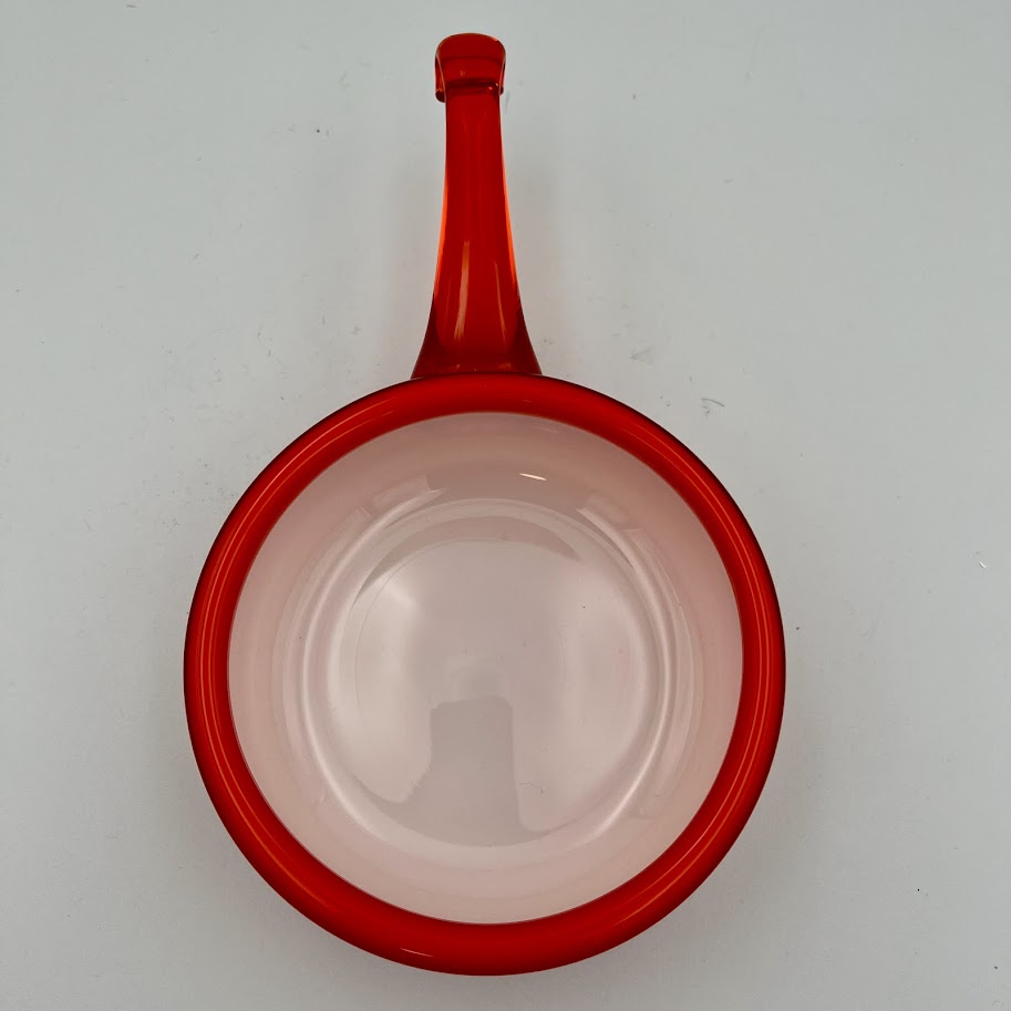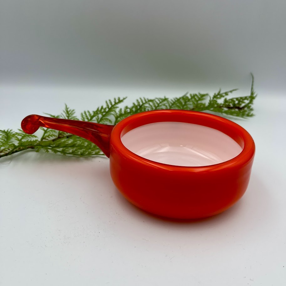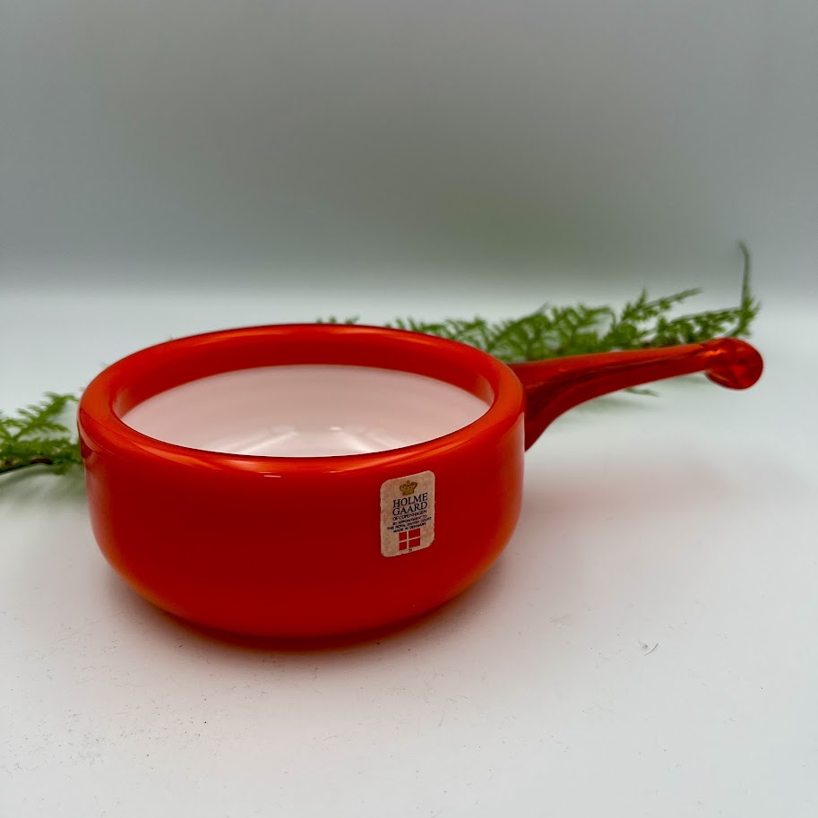 Holmegaard glasskål med hank i rød/orange – funktionel, dekorativ og klassisk dansk design.