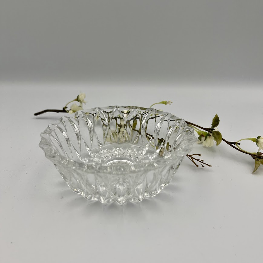 Smuk skål i facetslebet glas med dekorativt mønster og klassisk udtryk.