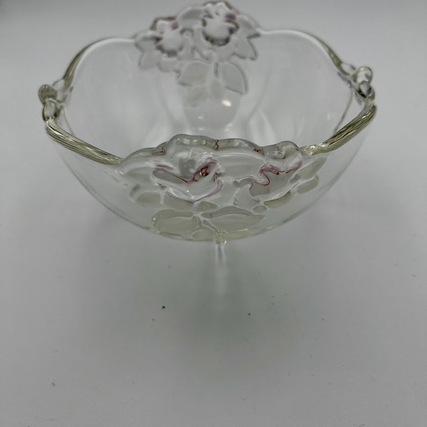 Smuk glasskål med dekorative detaljer og bølget kant, der giver et elegant og let udtryk.
