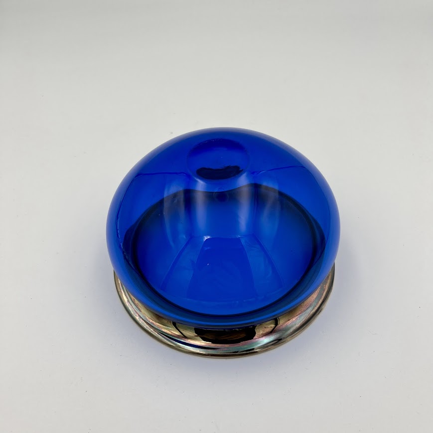 Smuk skål fra Holmegaard i dyb blå glas med elegant sølvkant.