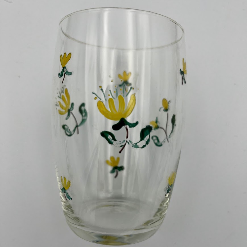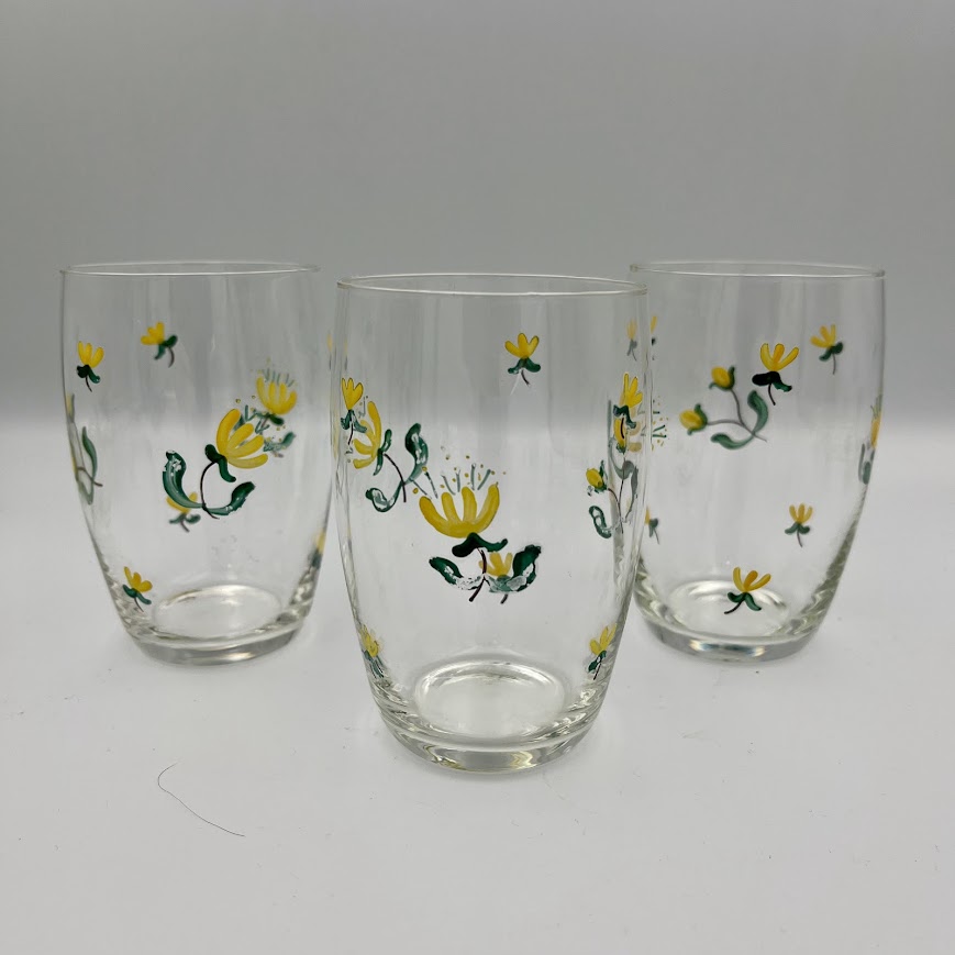 Sæt med 6 fine drikkeglas i klart glas dekoreret med små gule blomster og grønne detaljer.