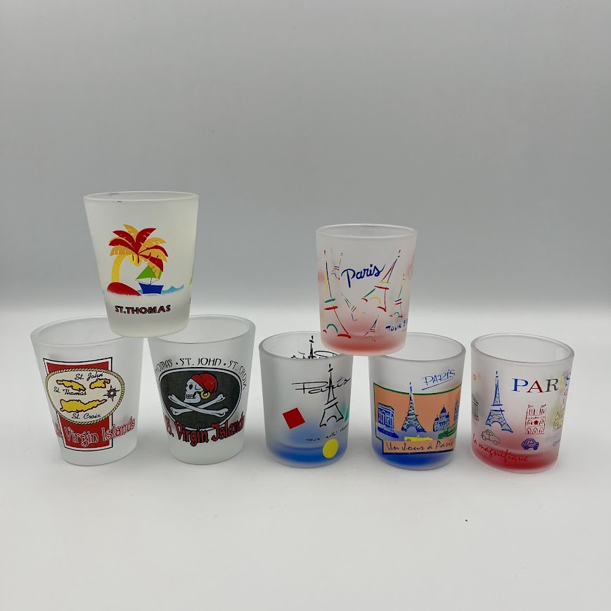 Souvenir snapsglas i sæt med forskellige motiver – farverige og charmerende.
