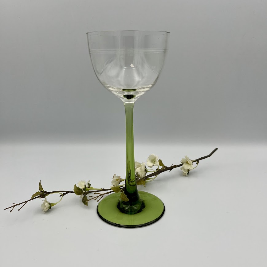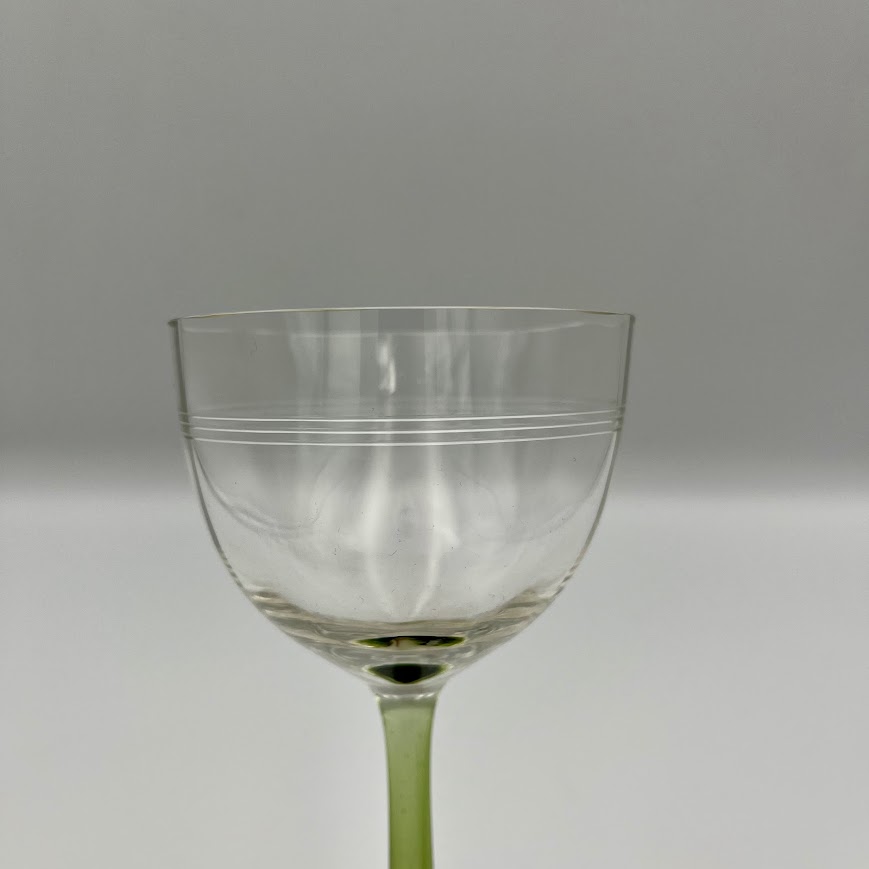 Elegant vinglas med klar kumme med ringslibninger og smuk grøn stilk og fod, som giver et let og stilfuldt udtryk.