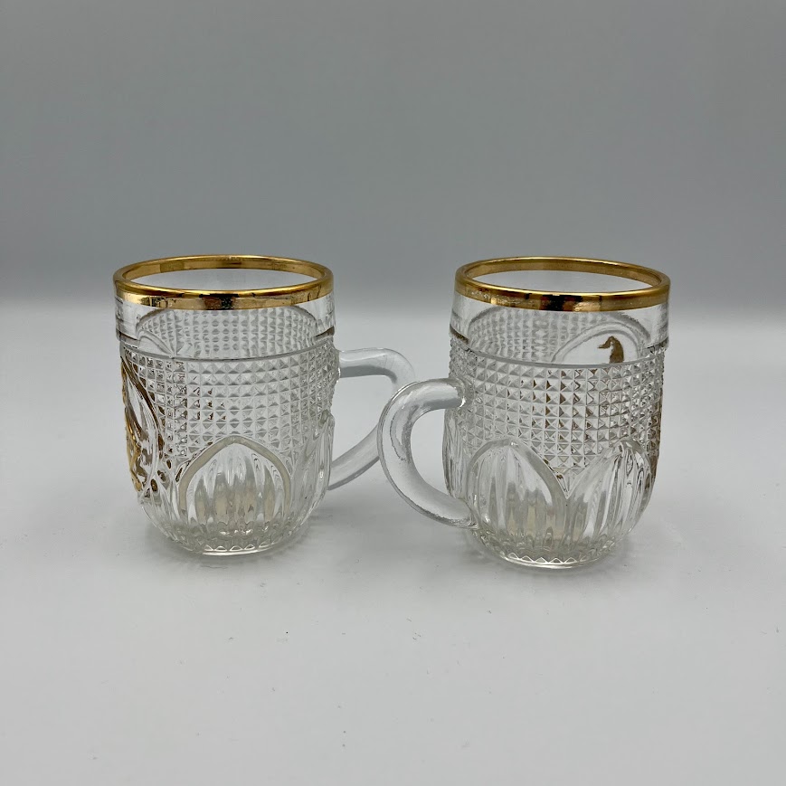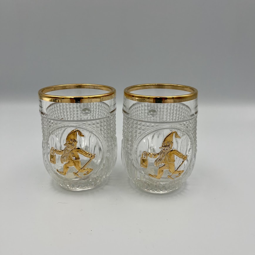 Glassene er udført i klart glas med en fin struktureret overflade og har et charmerende motiv af en lille figur i guld, som giver et unikt og nostalgisk udtryk.
