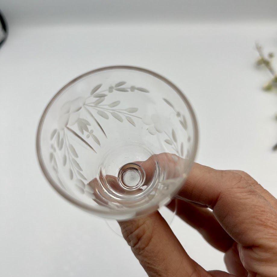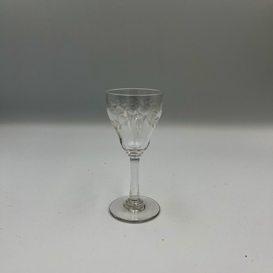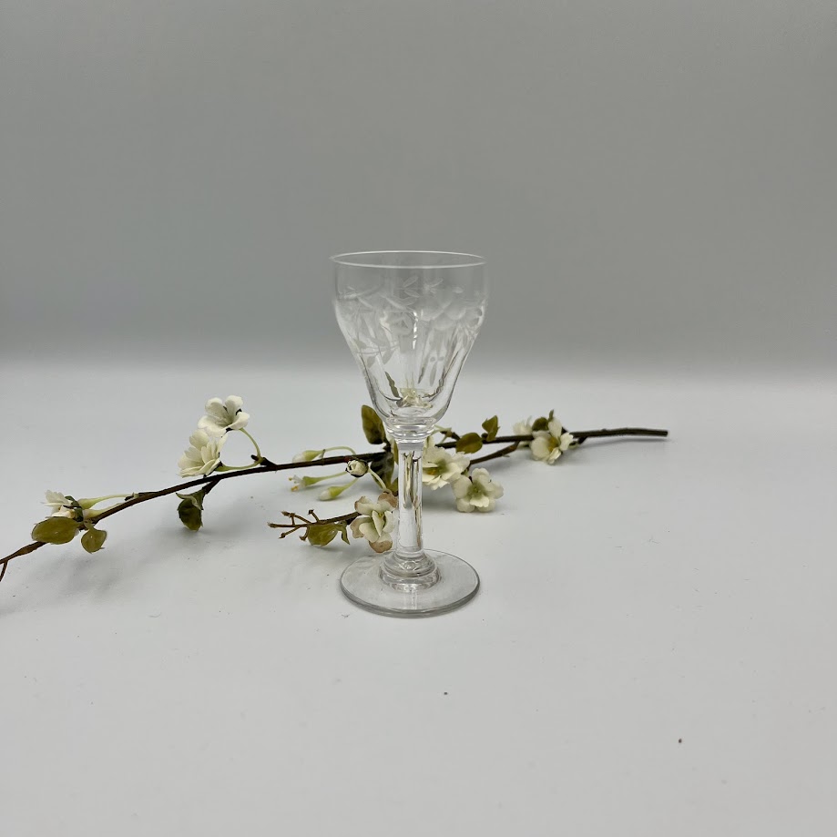 Vintage glas på stilk med slebne blomsterdetaljer. Elegant til vin, likør eller dessert.