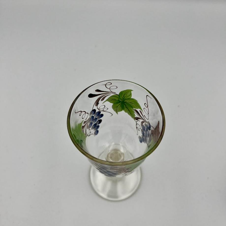 Smukt vintage glas på stilk med dekorativt motiv af druer og blade i grønne og blå nuancer.
