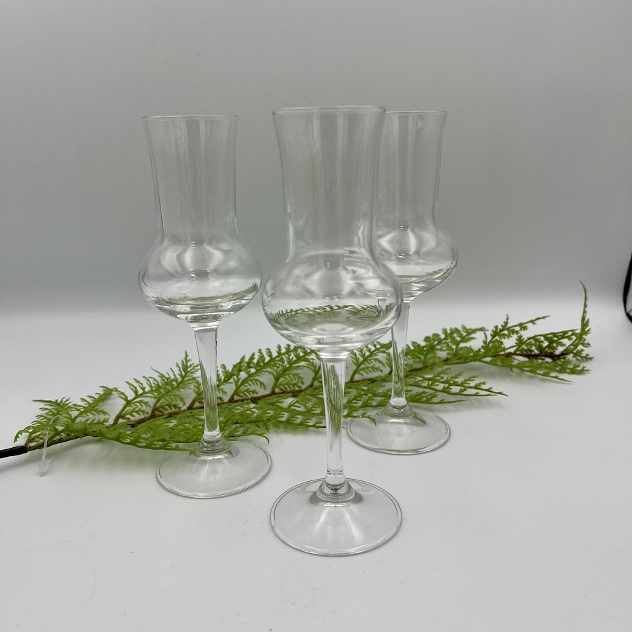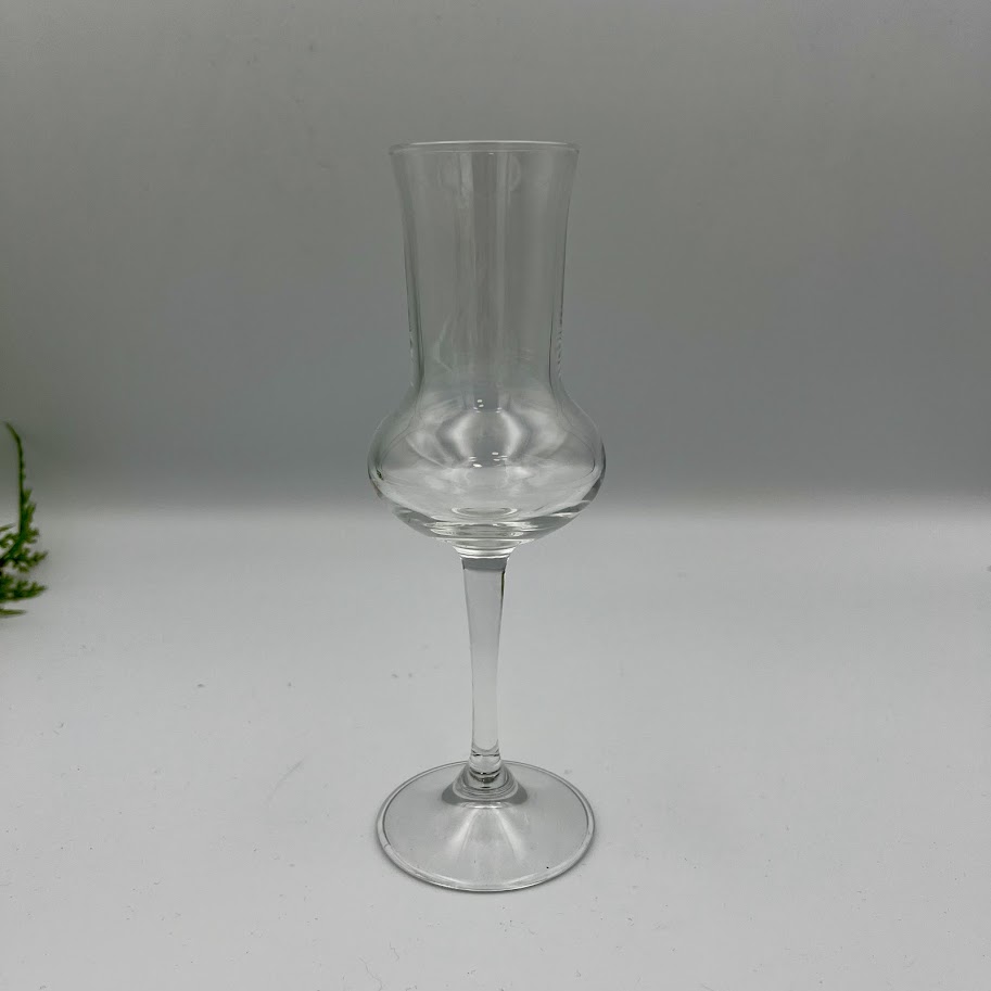 Elegant grappaglas i klart glas med slank stilk og karakteristisk buet kumme, der samler aromaen og fremhæver smagsnuancerne i grappa.