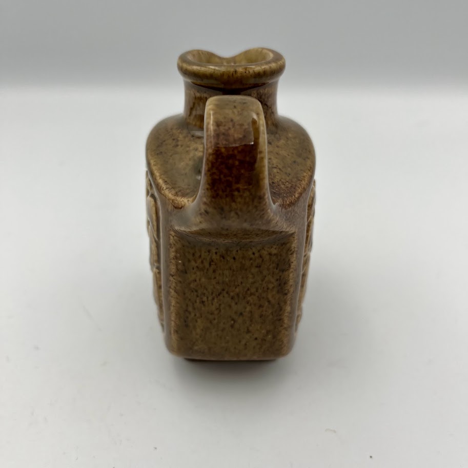 Lille keramikflaske med hank og dekorativt relief i brunmeleret glasur.