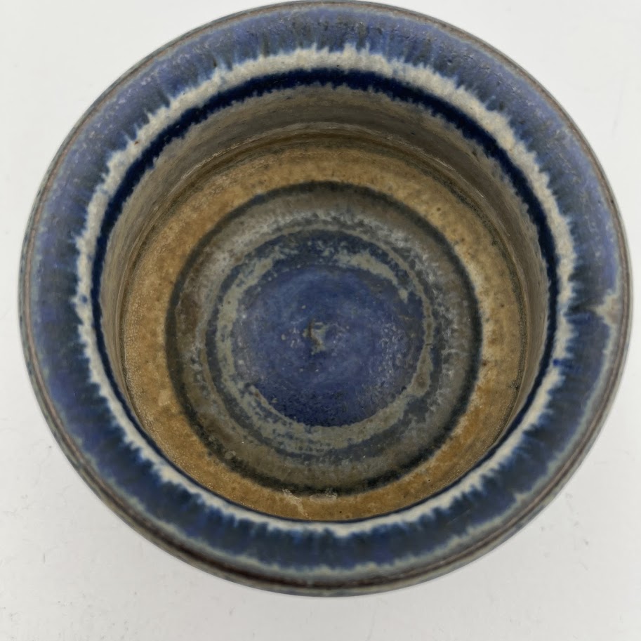 Skålen er udført i stentøj med karakteristisk blå dekoration og rustik glasur, som er typisk for Bornholmsk keramik.