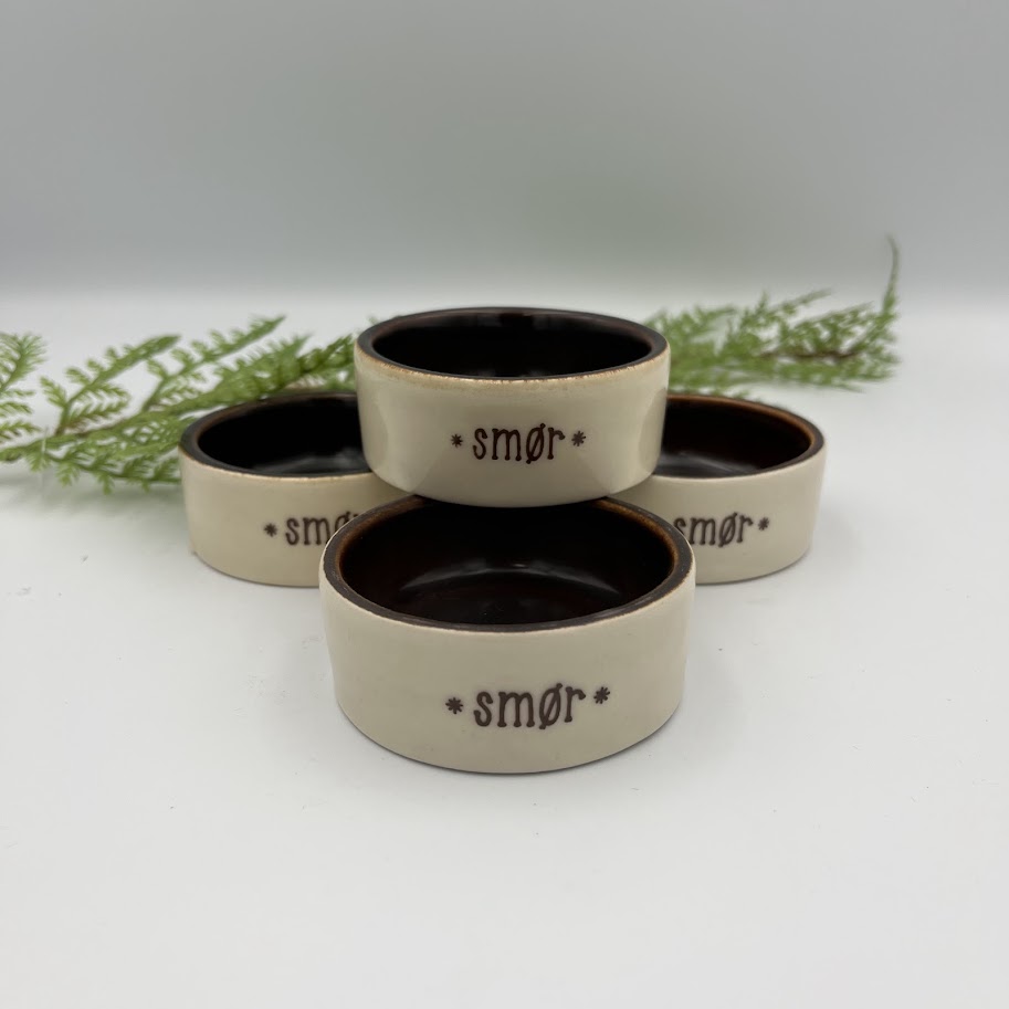 Skålene har et klassisk og hyggeligt udtryk med lys yderside, mørk glasur indvendigt og teksten “smør” på fronten.