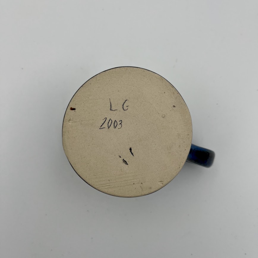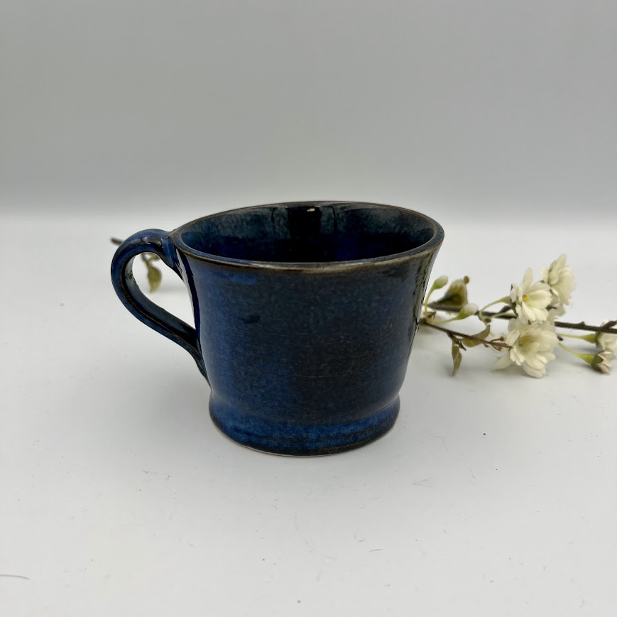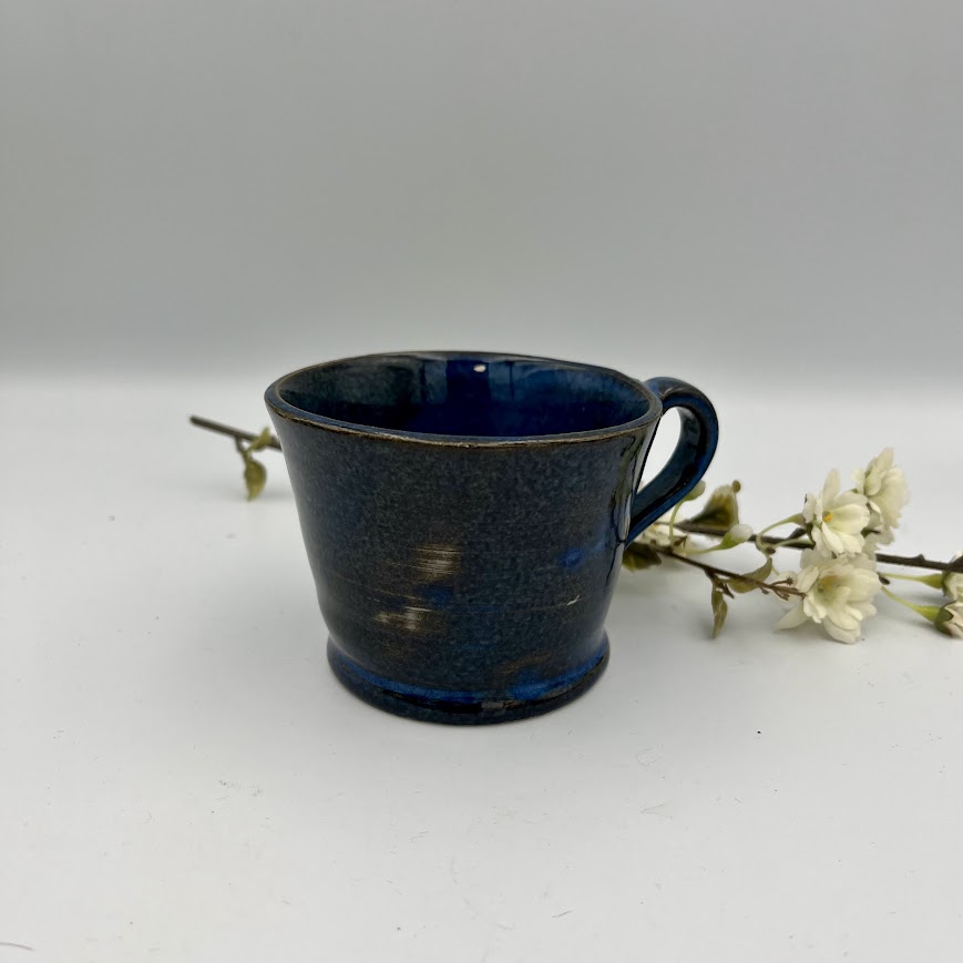 Flot keramik kop i dyb blå glasur med et rustikt og levende udtryk.