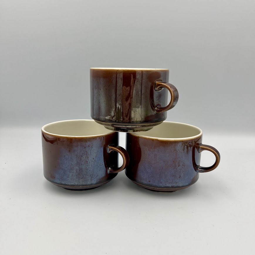 Sæt med 3 rustikke kopper i keramik med smuk brun glasur og levende farvespil.