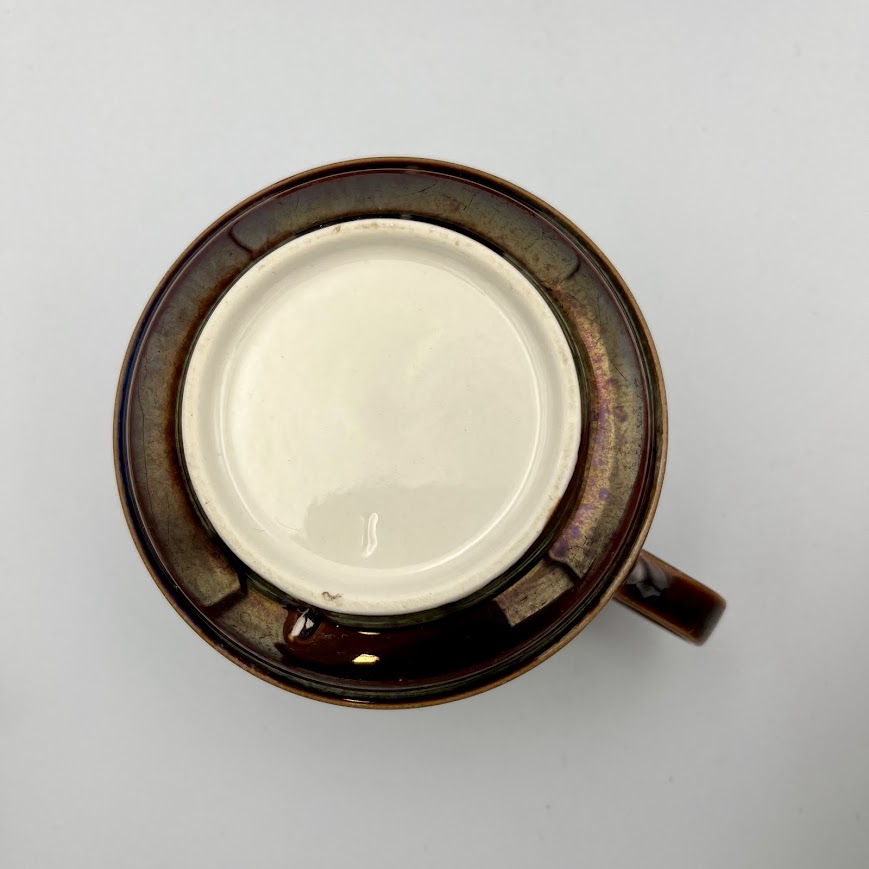 Glasuren varierer fra mørkebrun til blålige nuancer, hvilket giver hver kop sit eget unikke udtryk.
