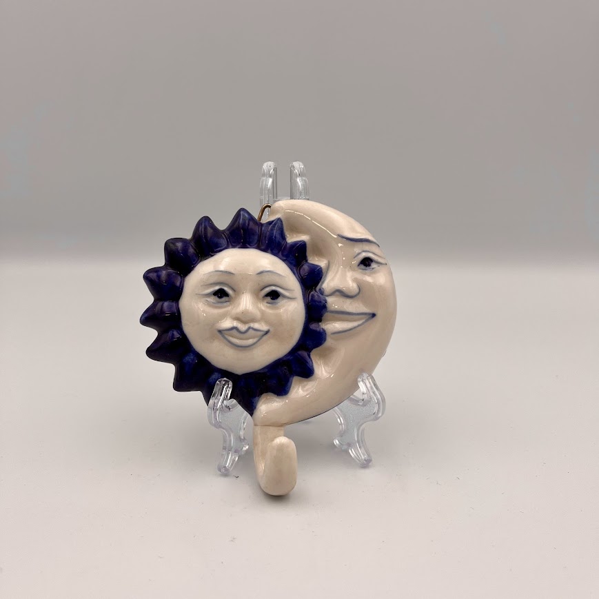 Charmerende keramik ophæng formet som sol og måne i ét smukt og fantasifuldt design.