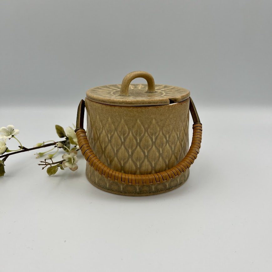 Marmeladekrukke/sukkerskål fra Reliefserien med låg og hank. Klassisk design i varm brun glasur – både praktisk og dekorativ.