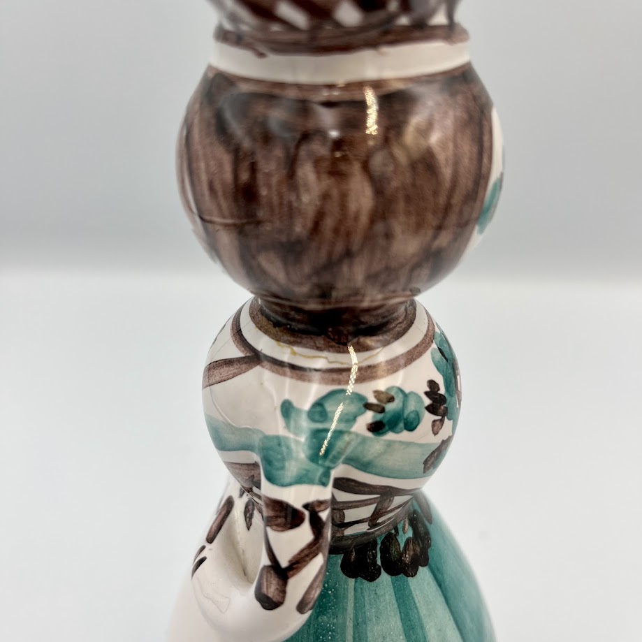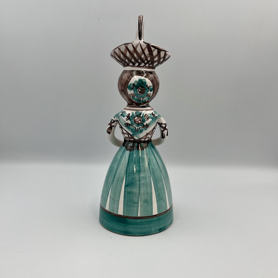 Figuren forestiller en kvinde i traditionel dragt med dekorative mønstre i brune og grønne nuancer, som giver et varmt og levende udtryk.