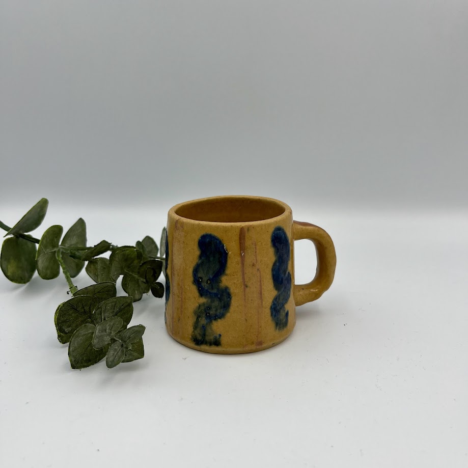 Charmerende lille keramik kop i et rustikt og kunstnerisk design med varm gul/brun glasur og dekorative, håndmalede mønstre i mørke nuancer.