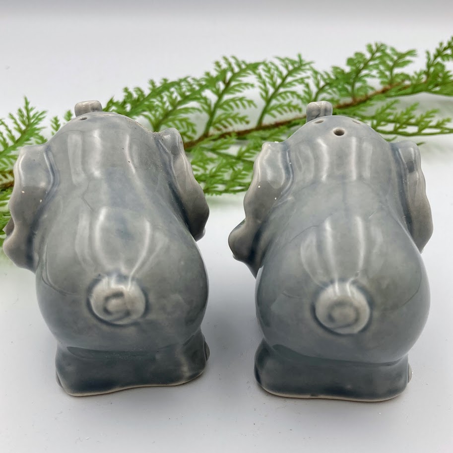 Sødt salt- og pebersæt formet som to små elefanter i grå keramik.