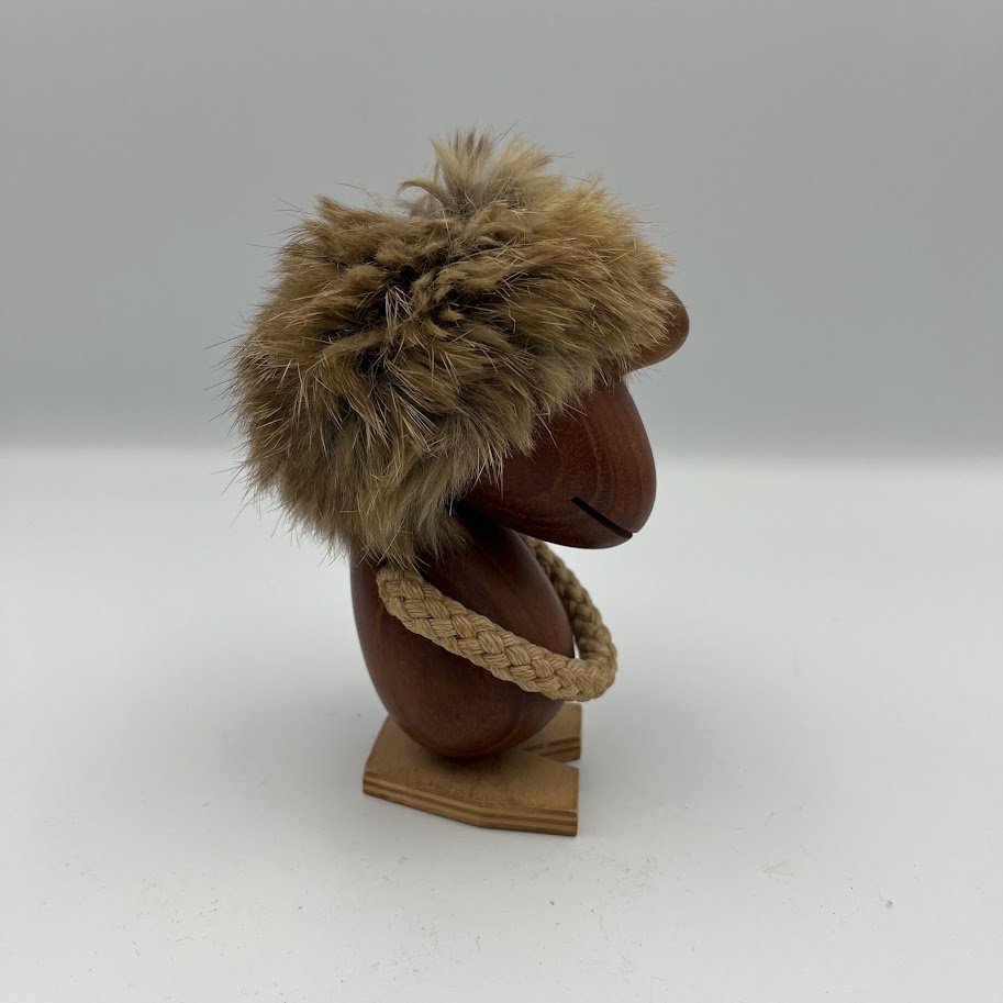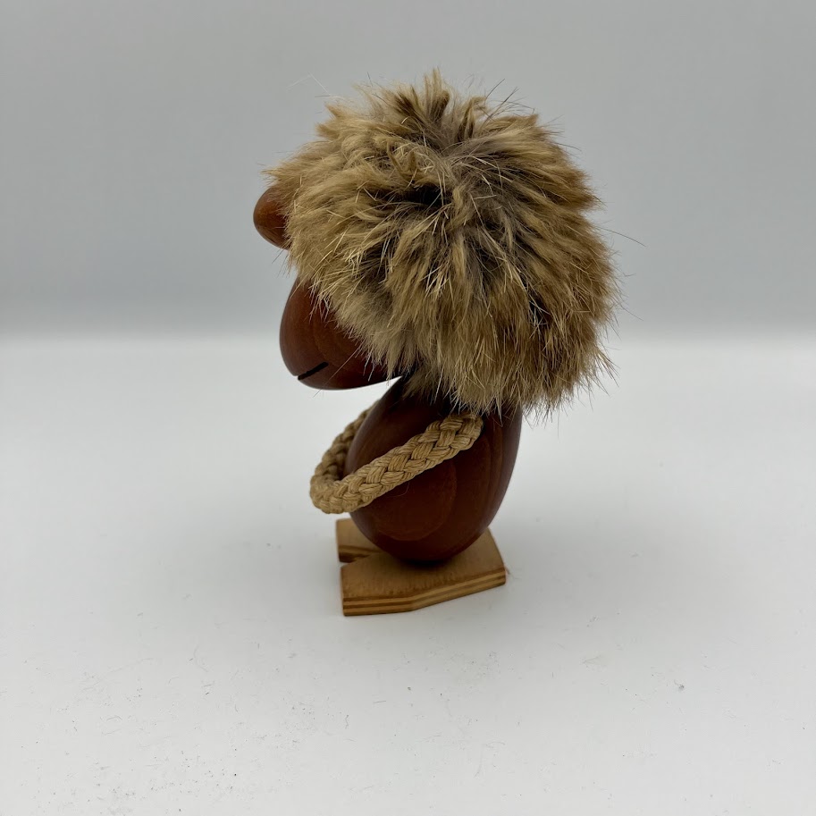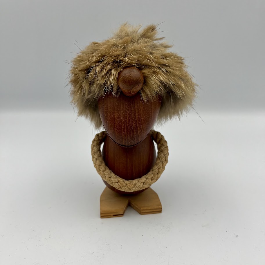 Figuren er udført i træ med en flot, varm glød og har et karakteristisk ansigt med en stor næse og fyldigt “hår” i naturmateriale, som giver masser af personlighed.