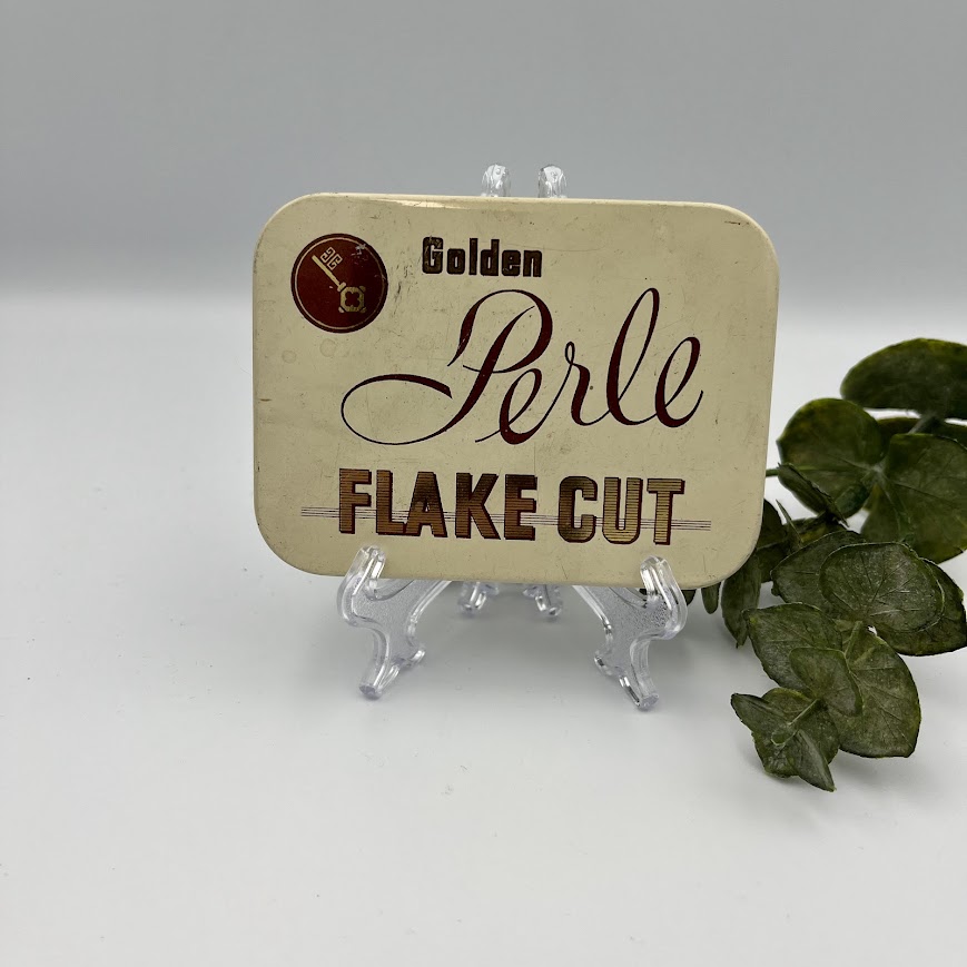 Vintage cigaret-/tobaksæske med teksten “Golden Perle Flake Cut” i klassisk og dekorativ typografi.