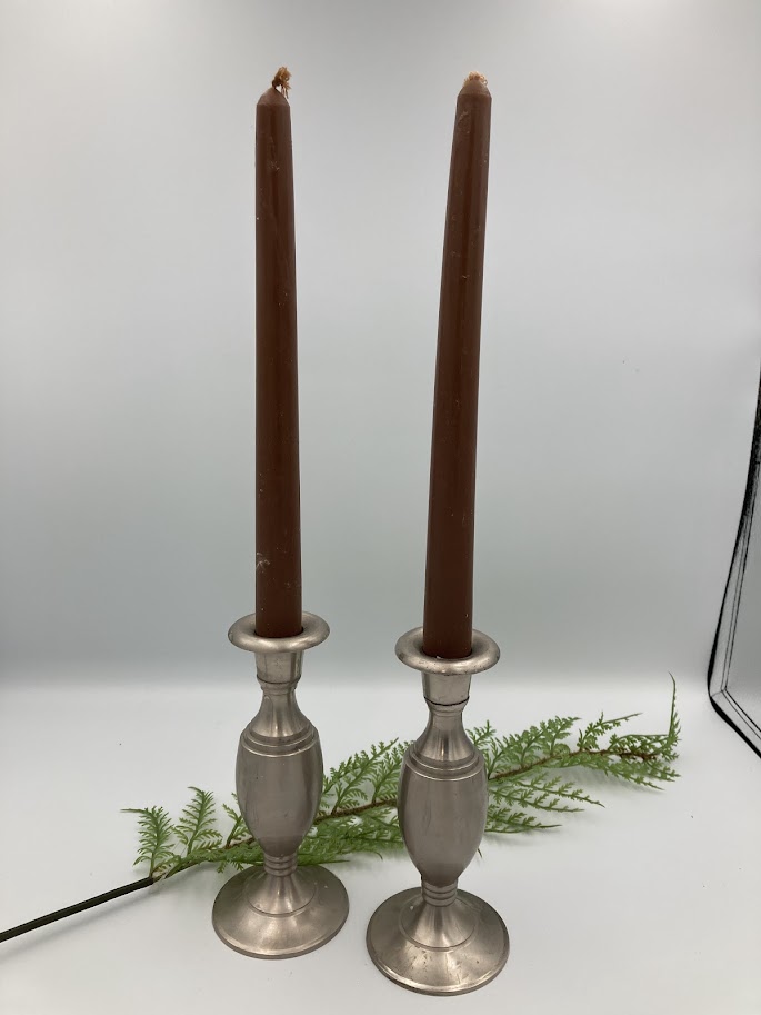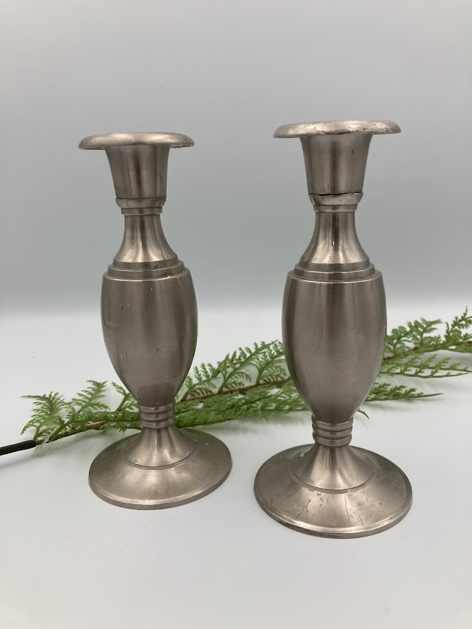 Sæt med to klassiske lysestager i sølvfarvet metal.