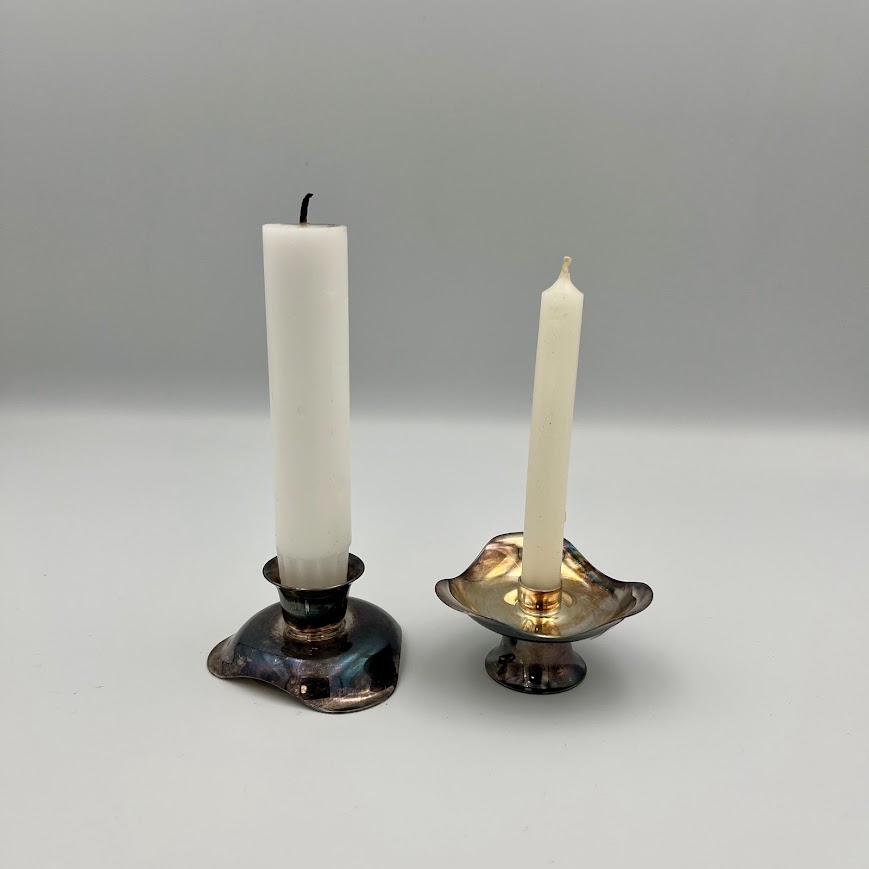 Sæt med to fine lysestager i metal med smuk, varm patina.