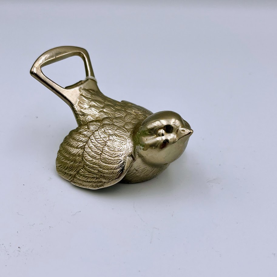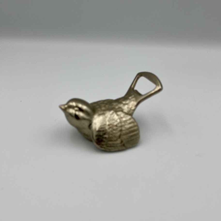 Flaskeåbner i metal formet som en fugl med dekorative detaljer.