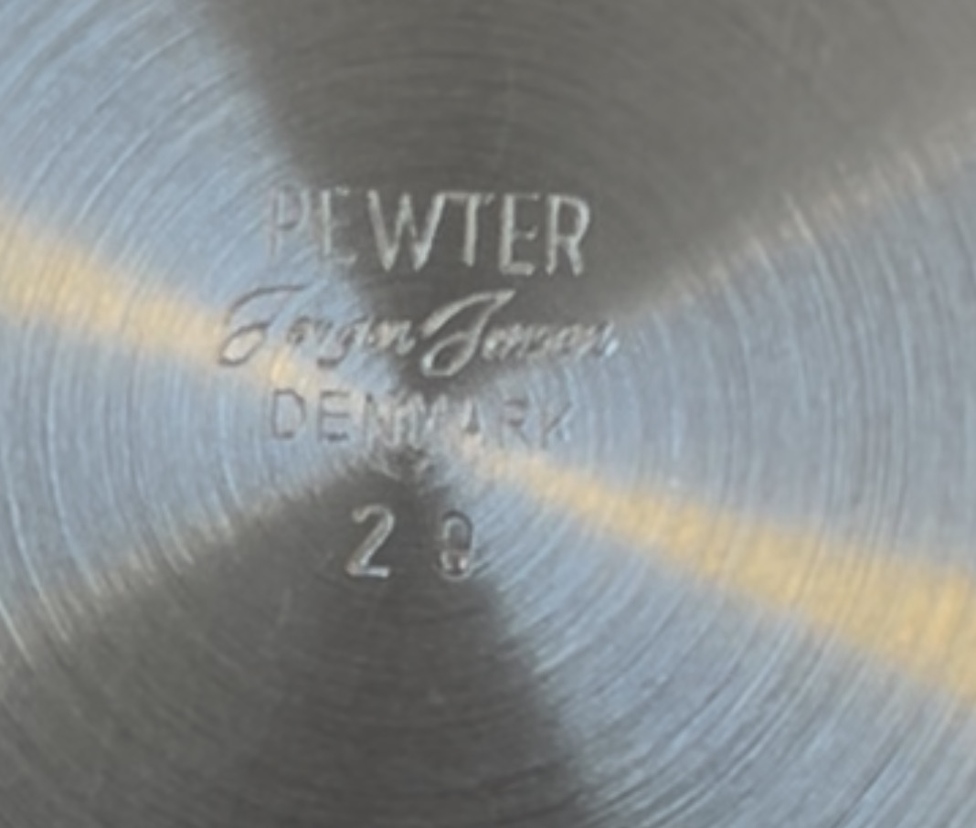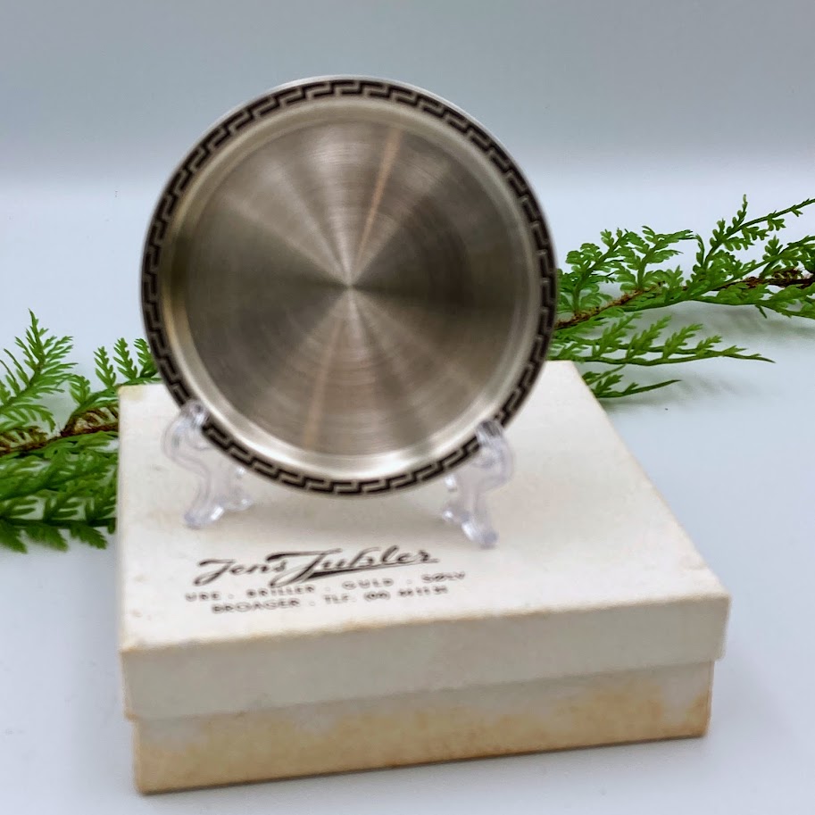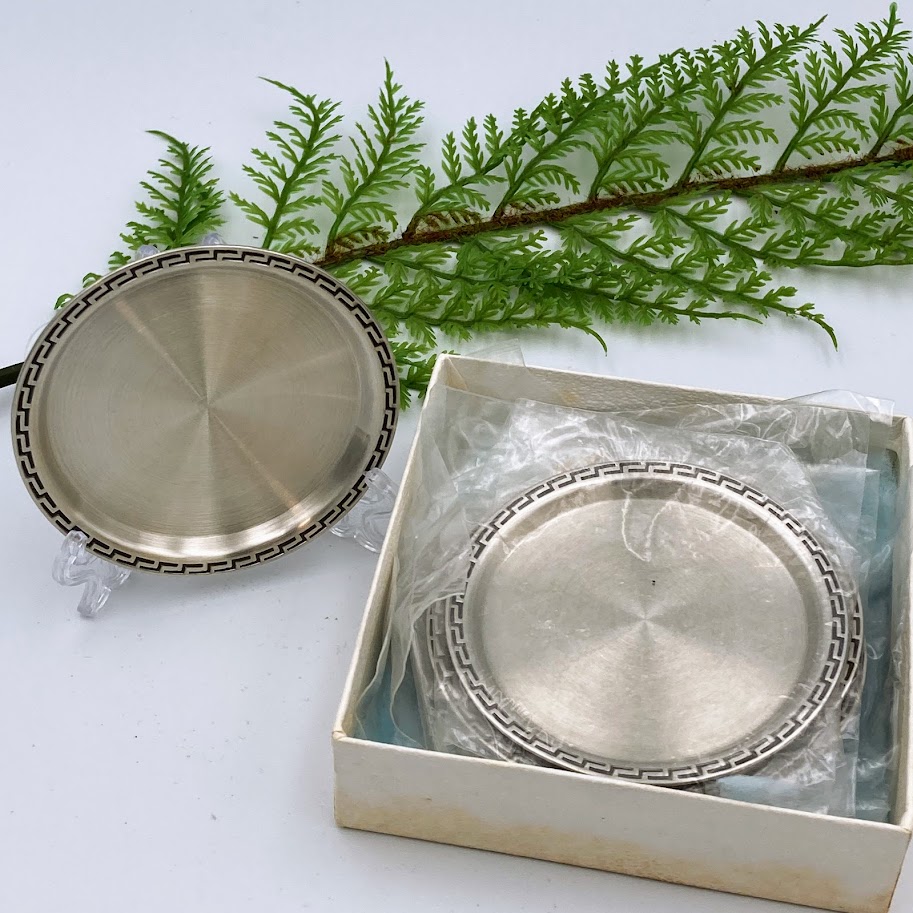 6 stk. runde ølbrikker fra Jørgen Jensen fra Pewter Danmarki metal med børstet overflade og dekorativ kant med græsk nøglemønster i sort.