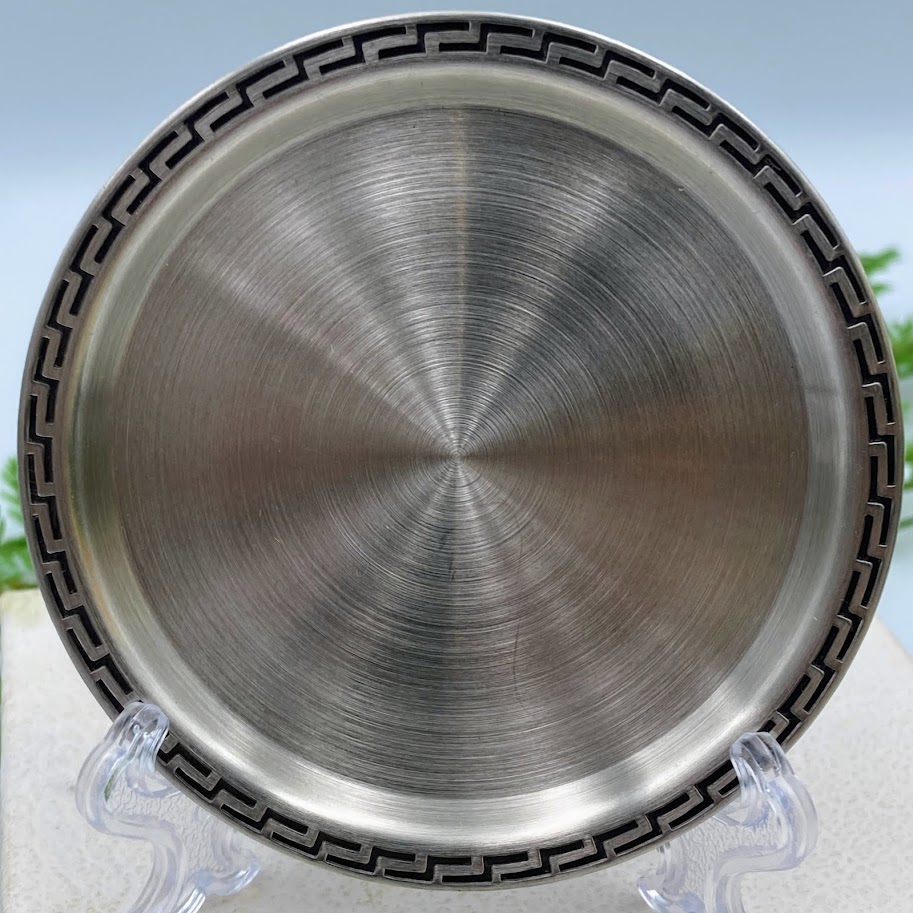 Rund ølbrik i metal med græsk nøglekant. Praktisk og dekorativ bordbeskyttelse.