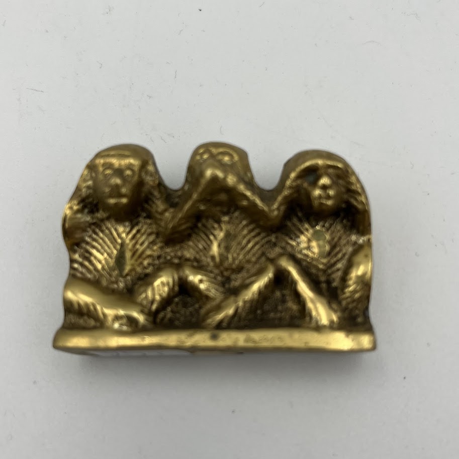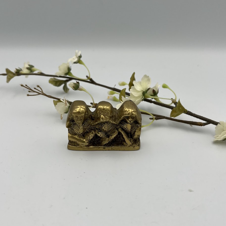 Dekorativ lille figur i messing med motiv af de tre vise aber – “intet se, intet høre, intet sige”.