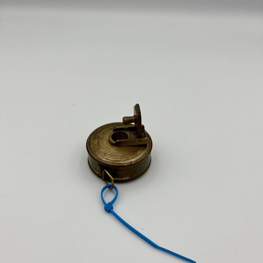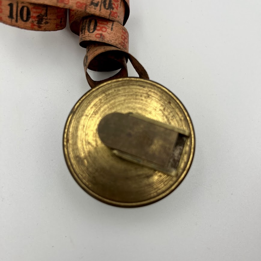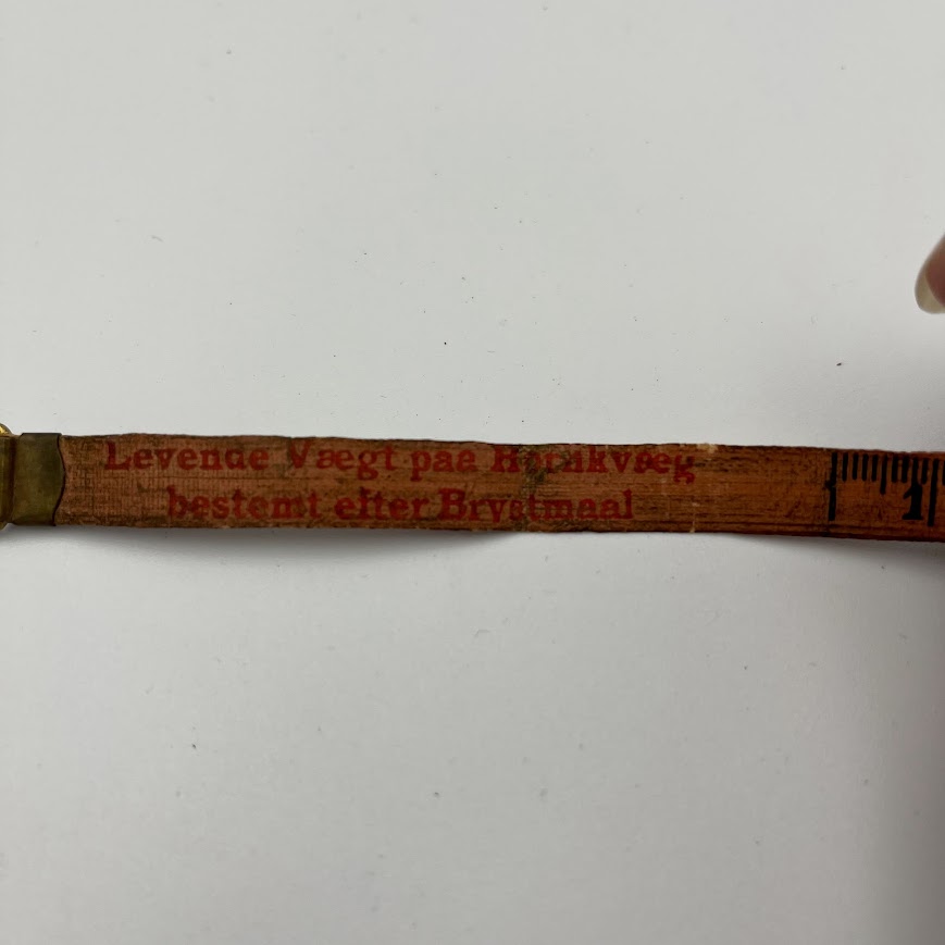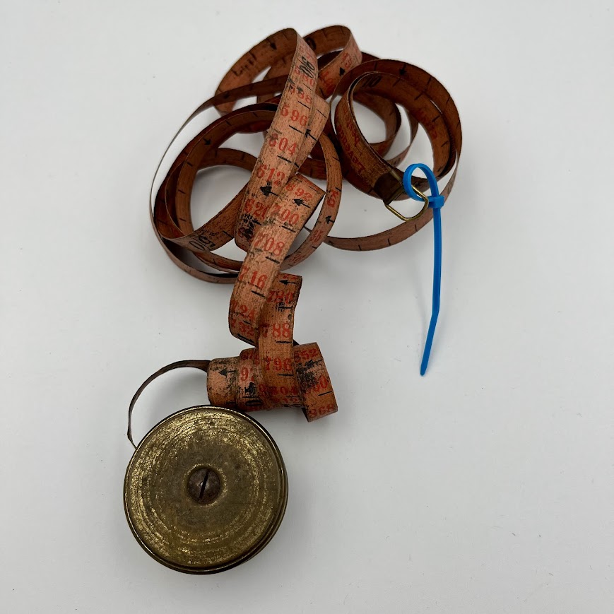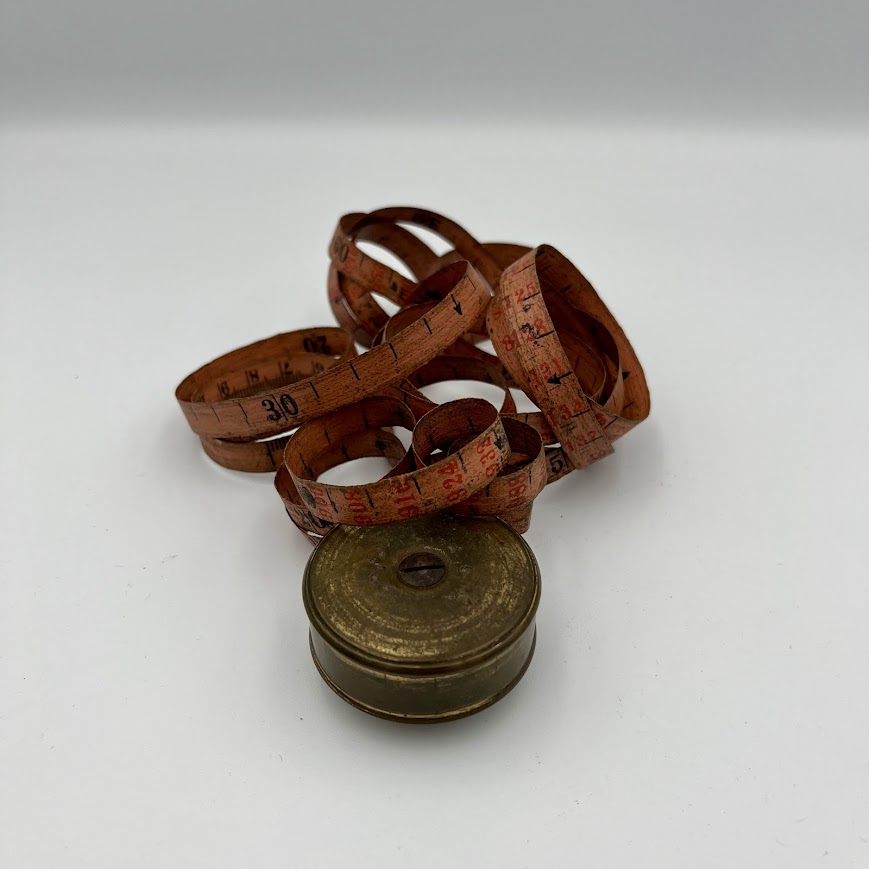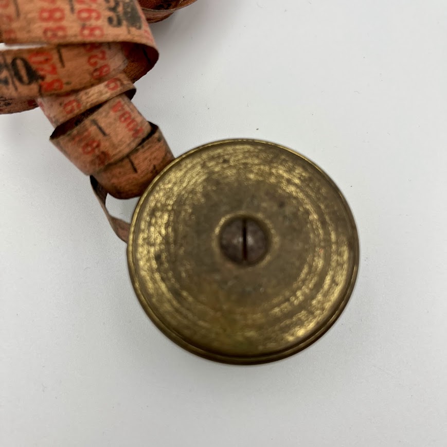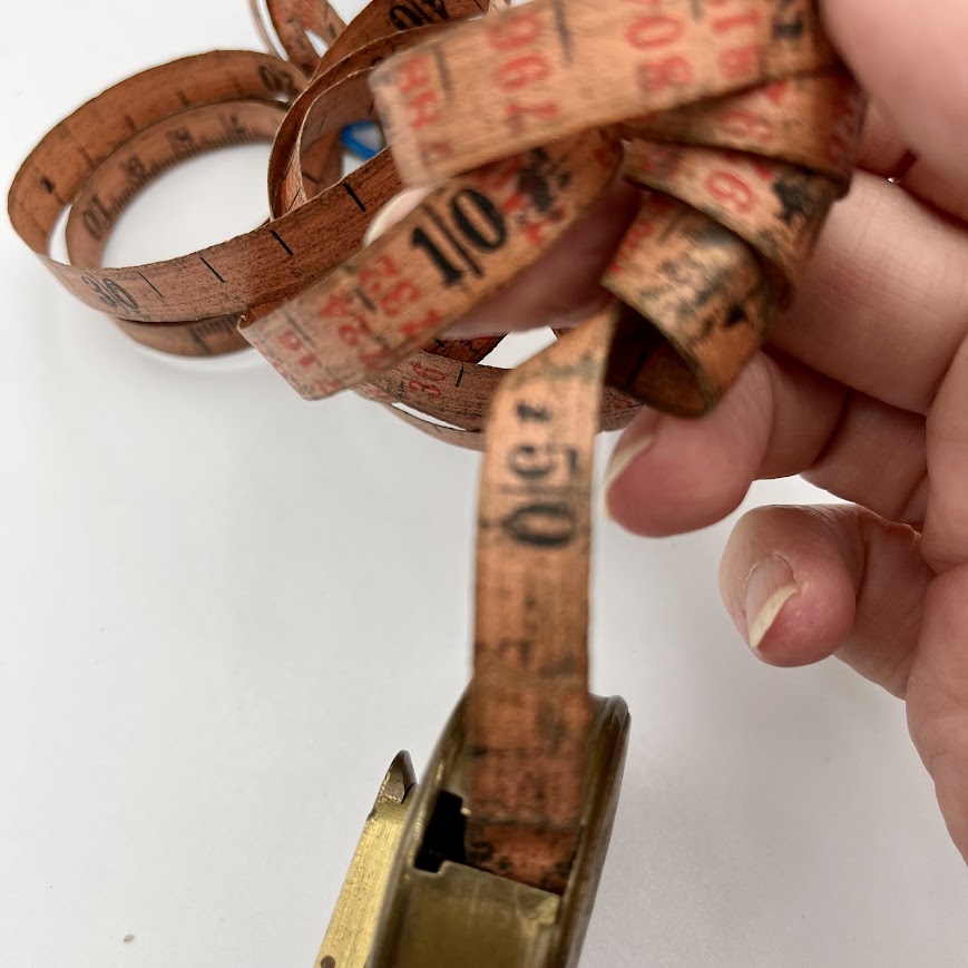 Målebåndet har tydelige tal og en smuk, naturlig patina, som giver det et autentisk og nostalgisk udtryk.