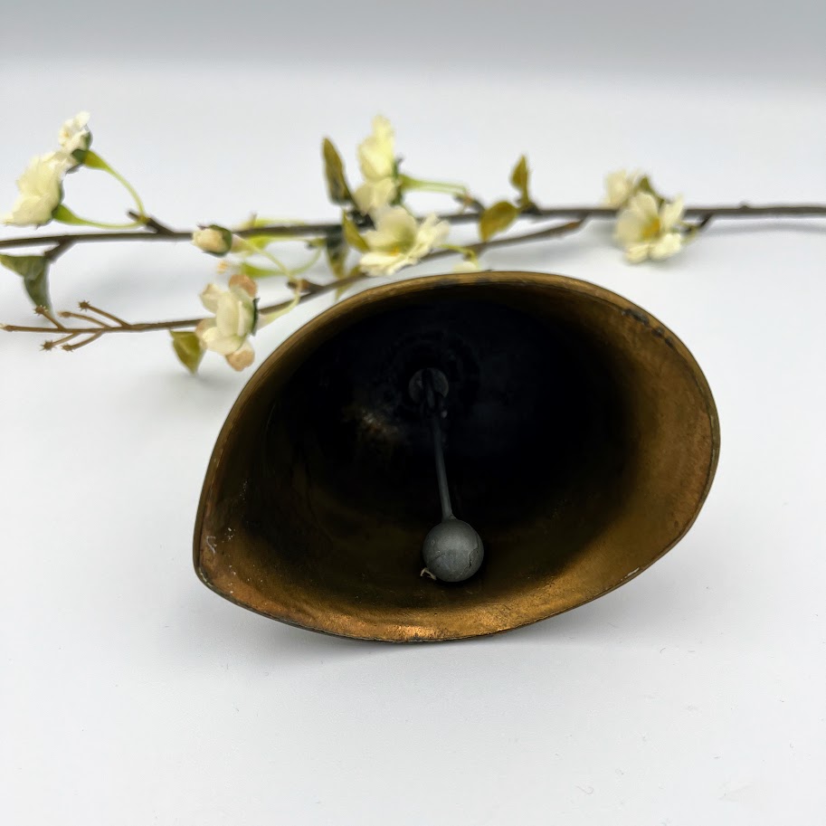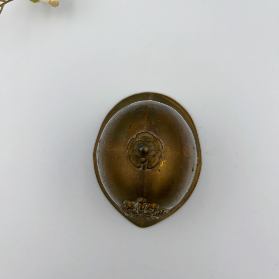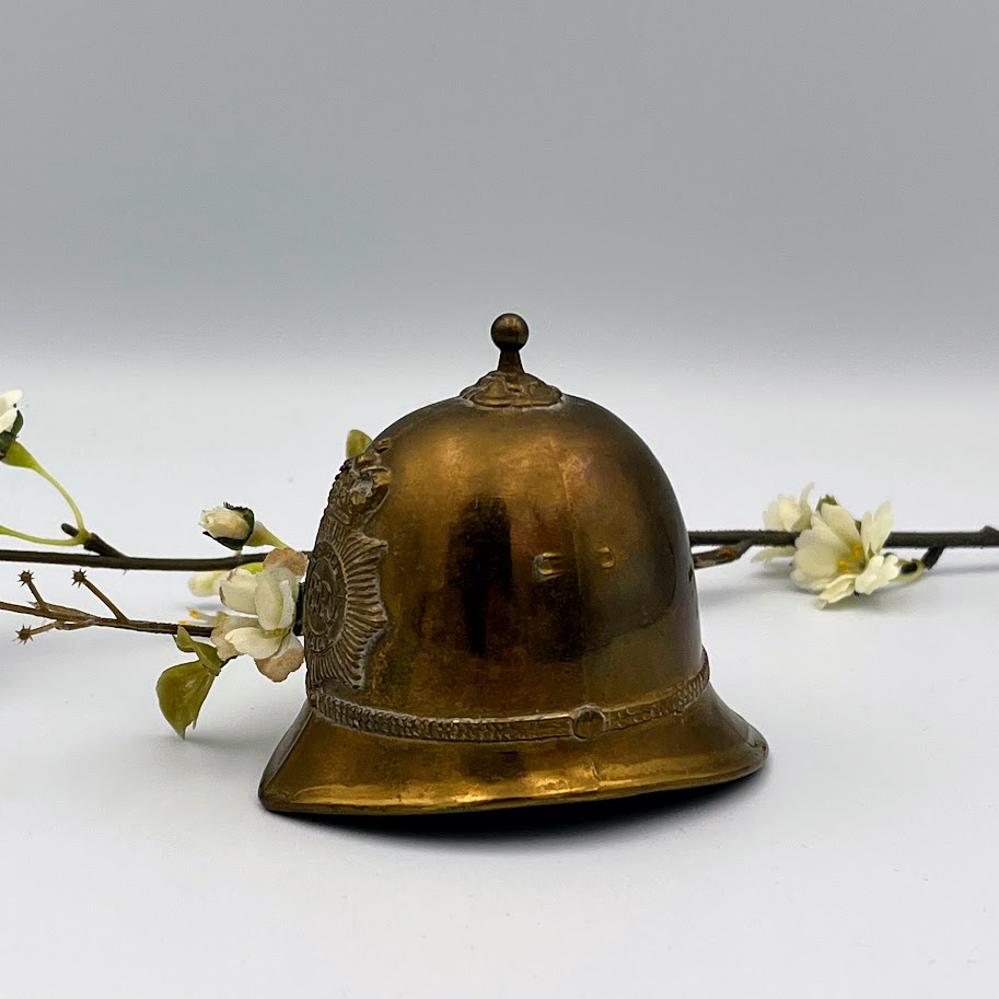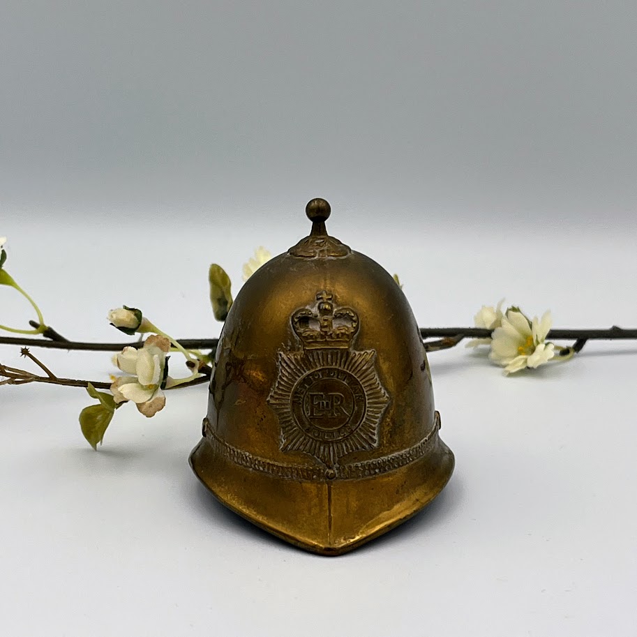 Vintage bordklokke i messing formet som britisk politi-hjelm med emblem og patina.