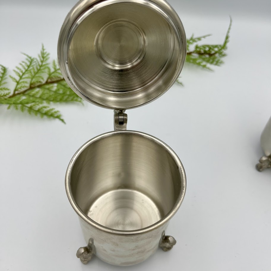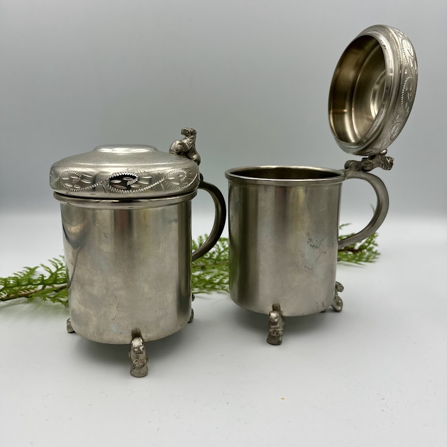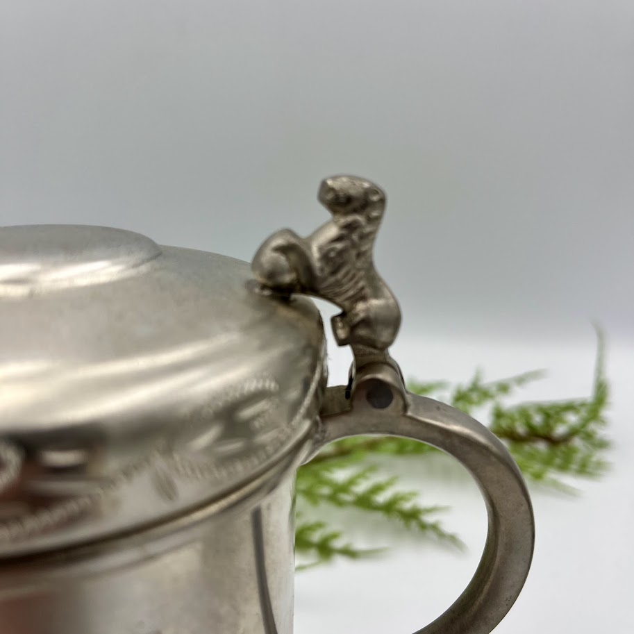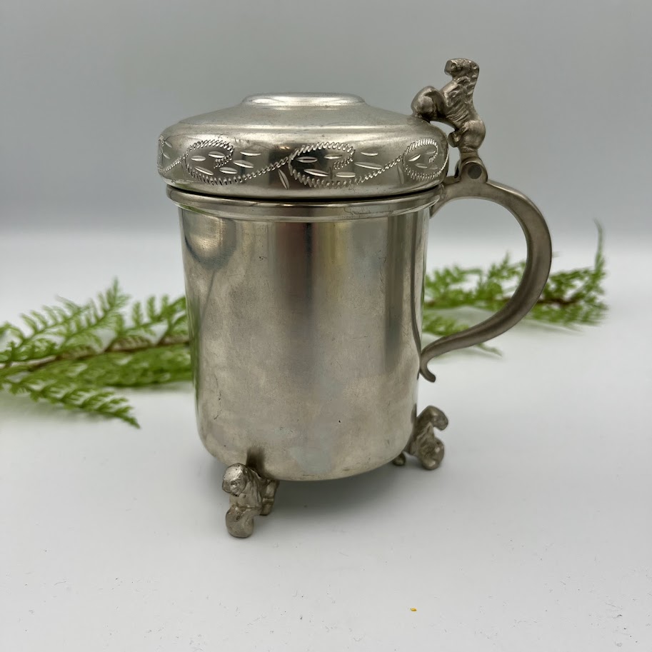 Charmerende ældre krus/bæger i metal med låg og dekorative detaljer.