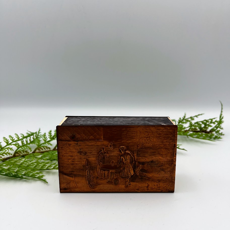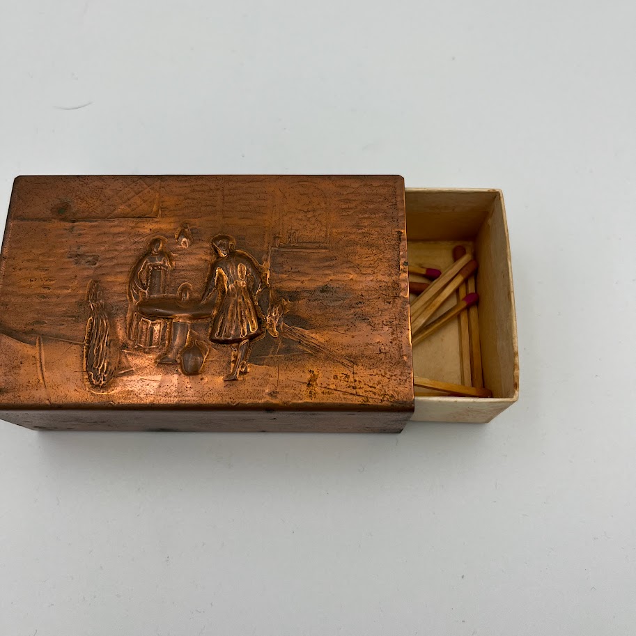 Kobber tændstik etui med præget landmotiv og indvendig udtræksskuffe.