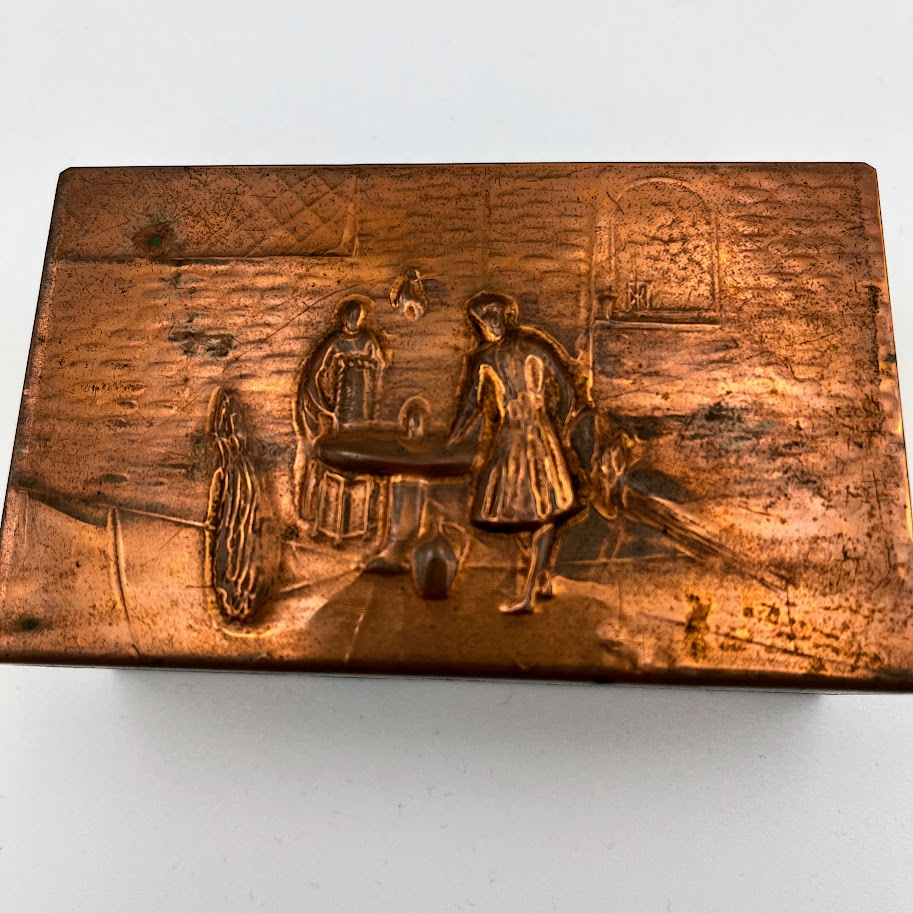 Dekorativ tændstikæske omslag i kobber med præget motiv på låget.