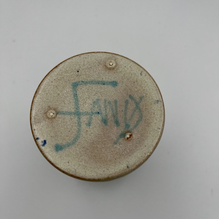 Vasen har en lys, sandfarvet glasur med små blå prikker langs halsen, som giver et diskret og dekorativt touch.