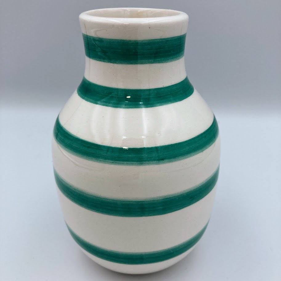 Hvid Kähler vase med grønne, lige vandrette striber. Enkel og pæn i udtrykket og nem at passe ind i de fleste hjem.